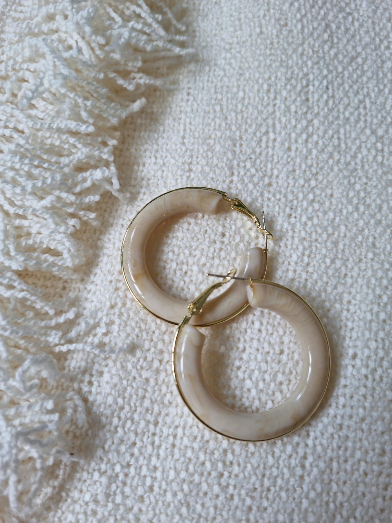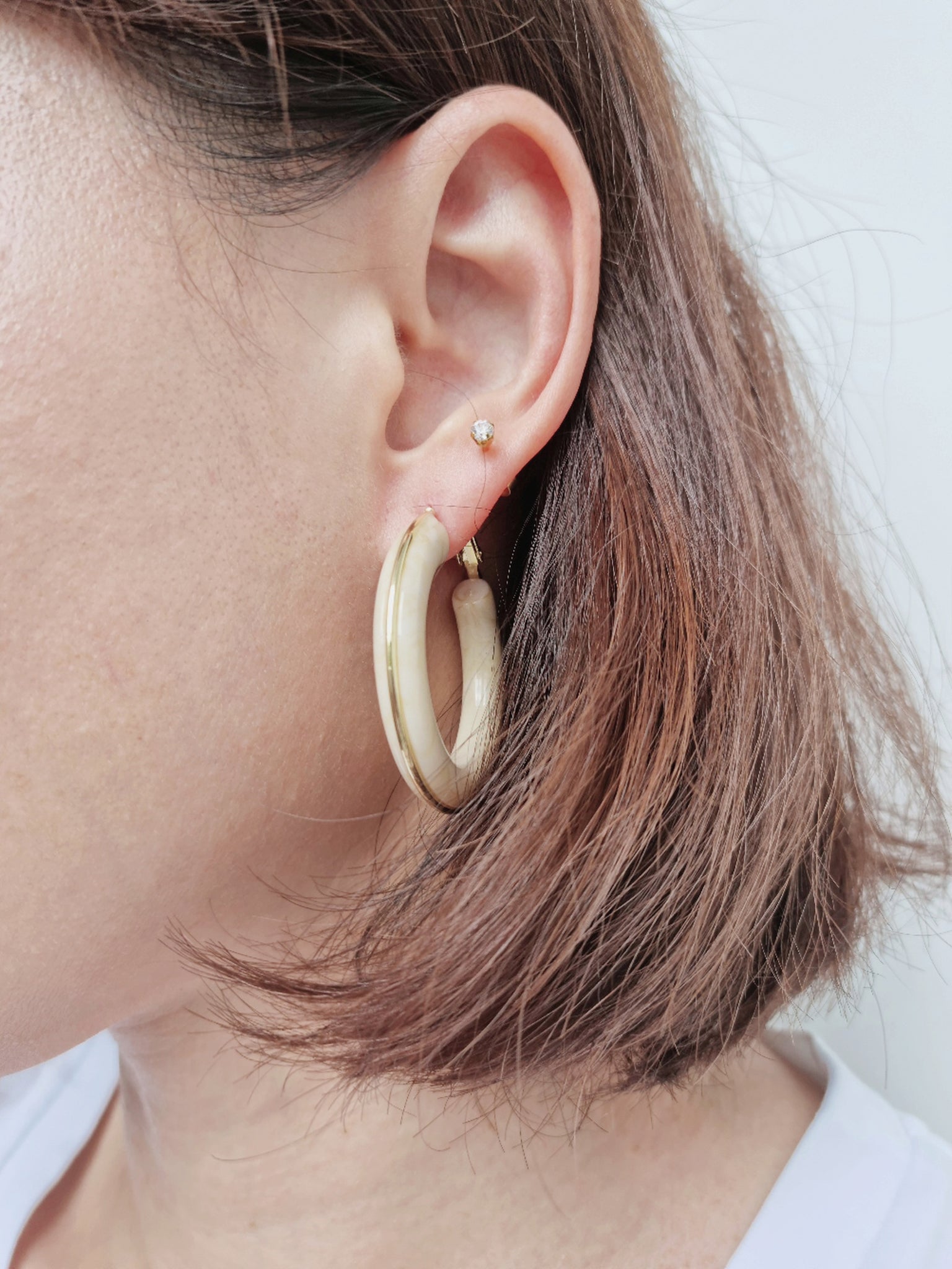 Our Caryn hoops are cast from gold-tone metal and ivory/tortoiseshell enamel. Curate them with dainty studs. Comes in 2 colours. Ivory and tortoiseshell