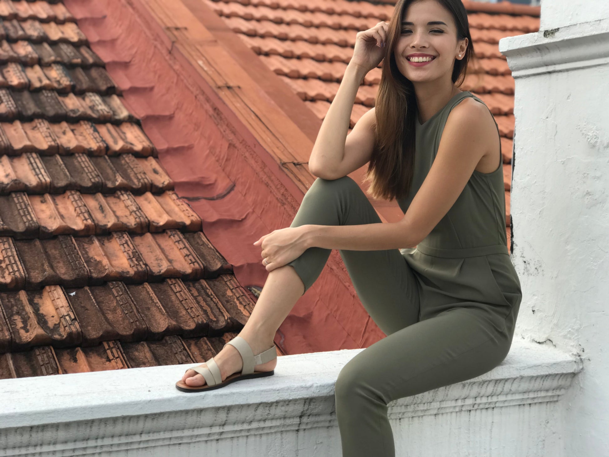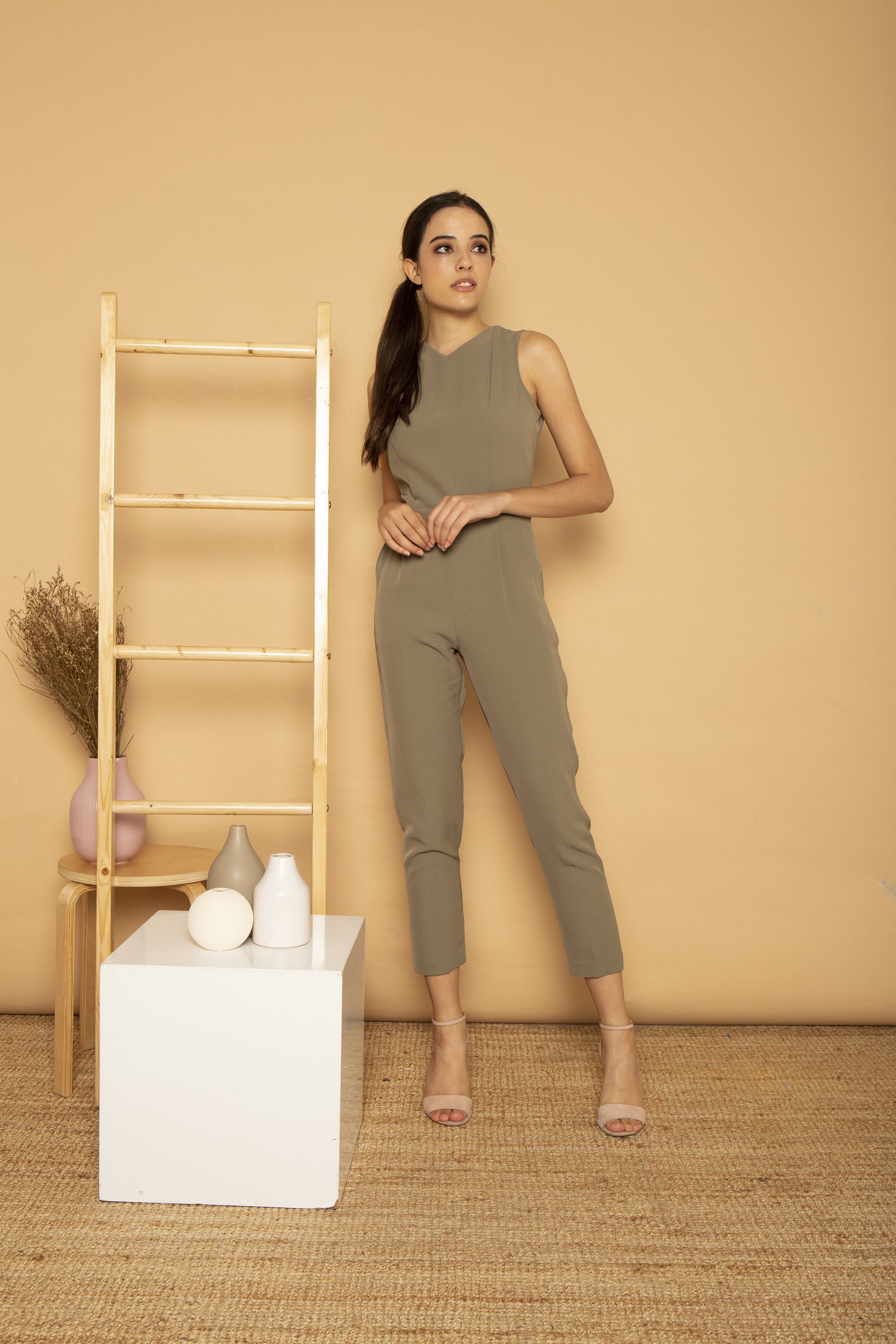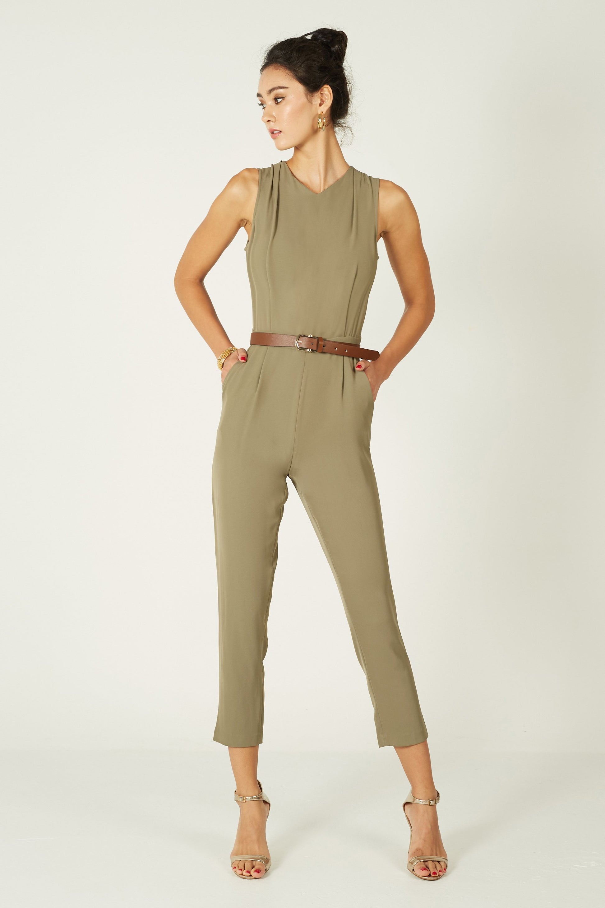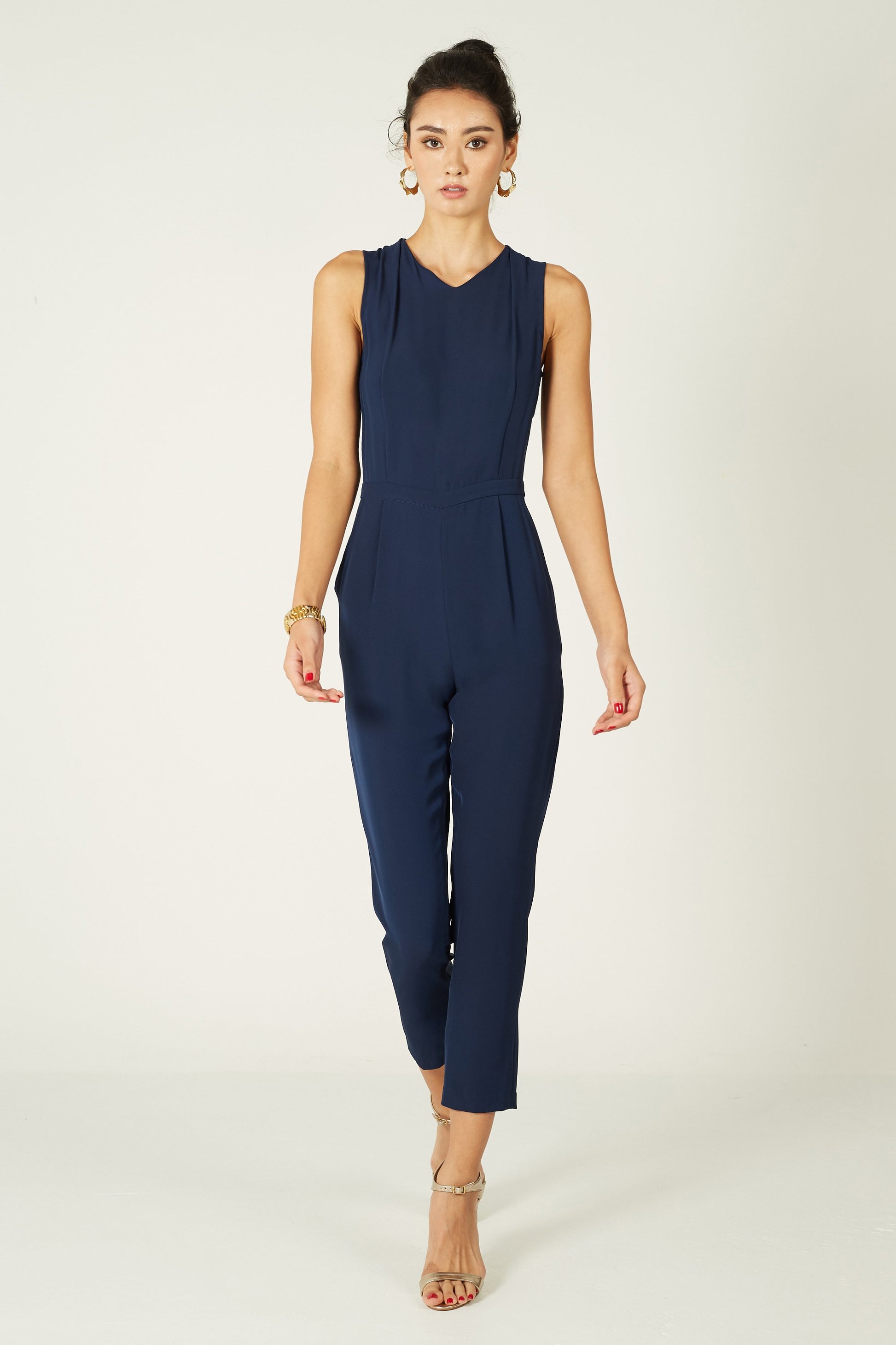 We all appreciate the power of a sleek jumpsuit - it's an easy-to-wear option that still feels polished and elegant. Our sleeveless Elsa jumpsuit features a shallow V neck with a chic pleat detail. The trousers fall to a slim silhouette while leaving some room on the thighs.