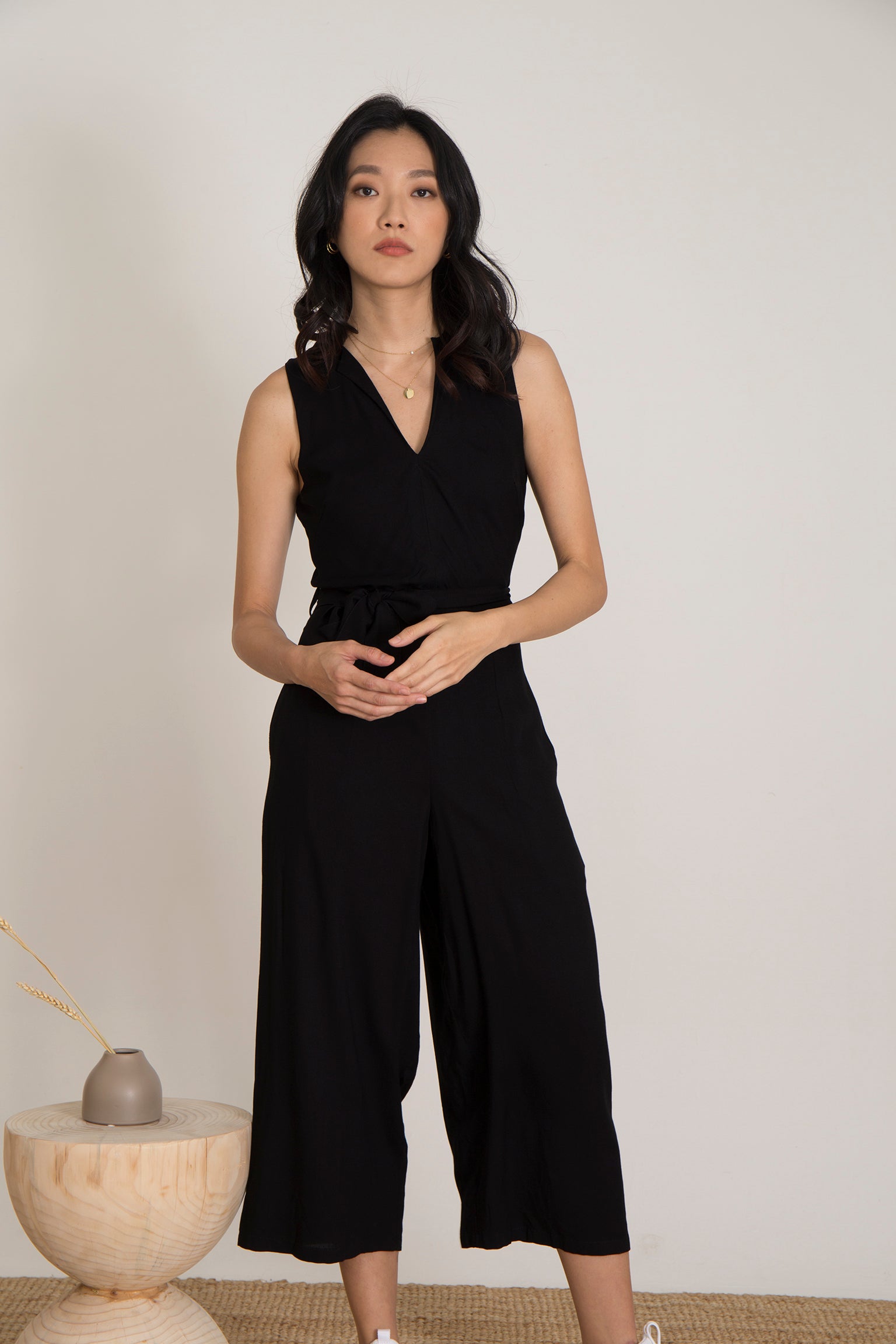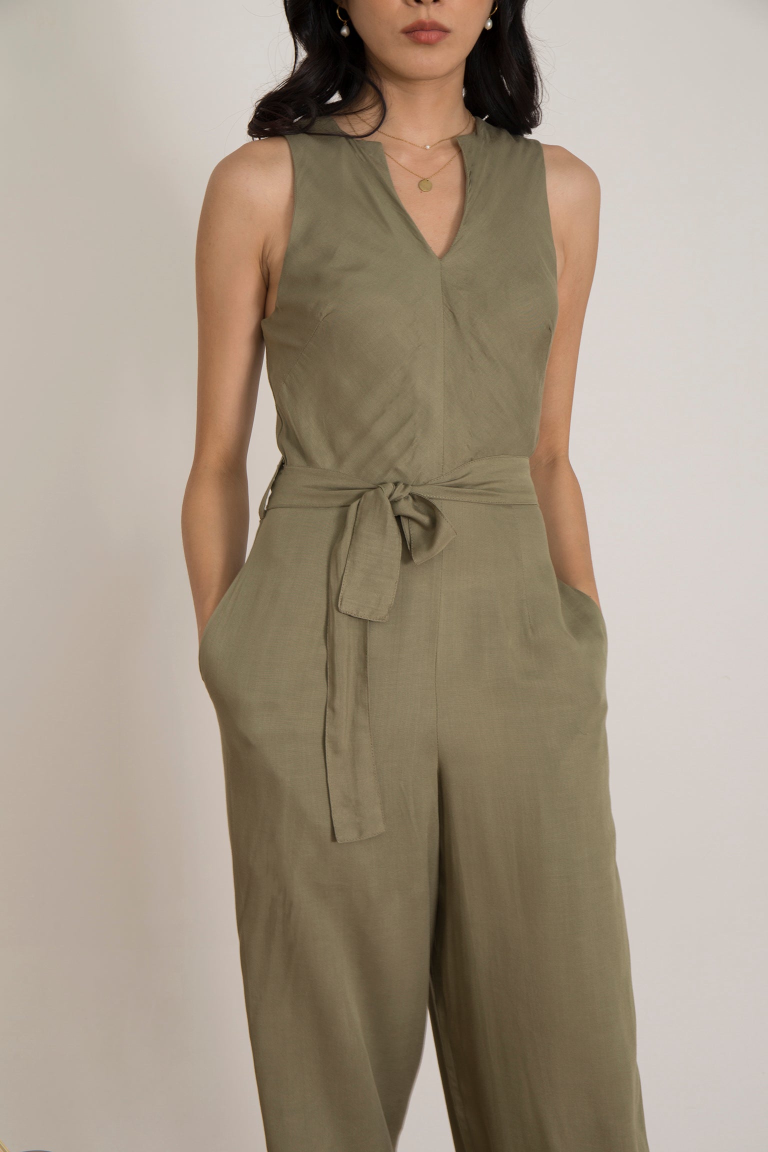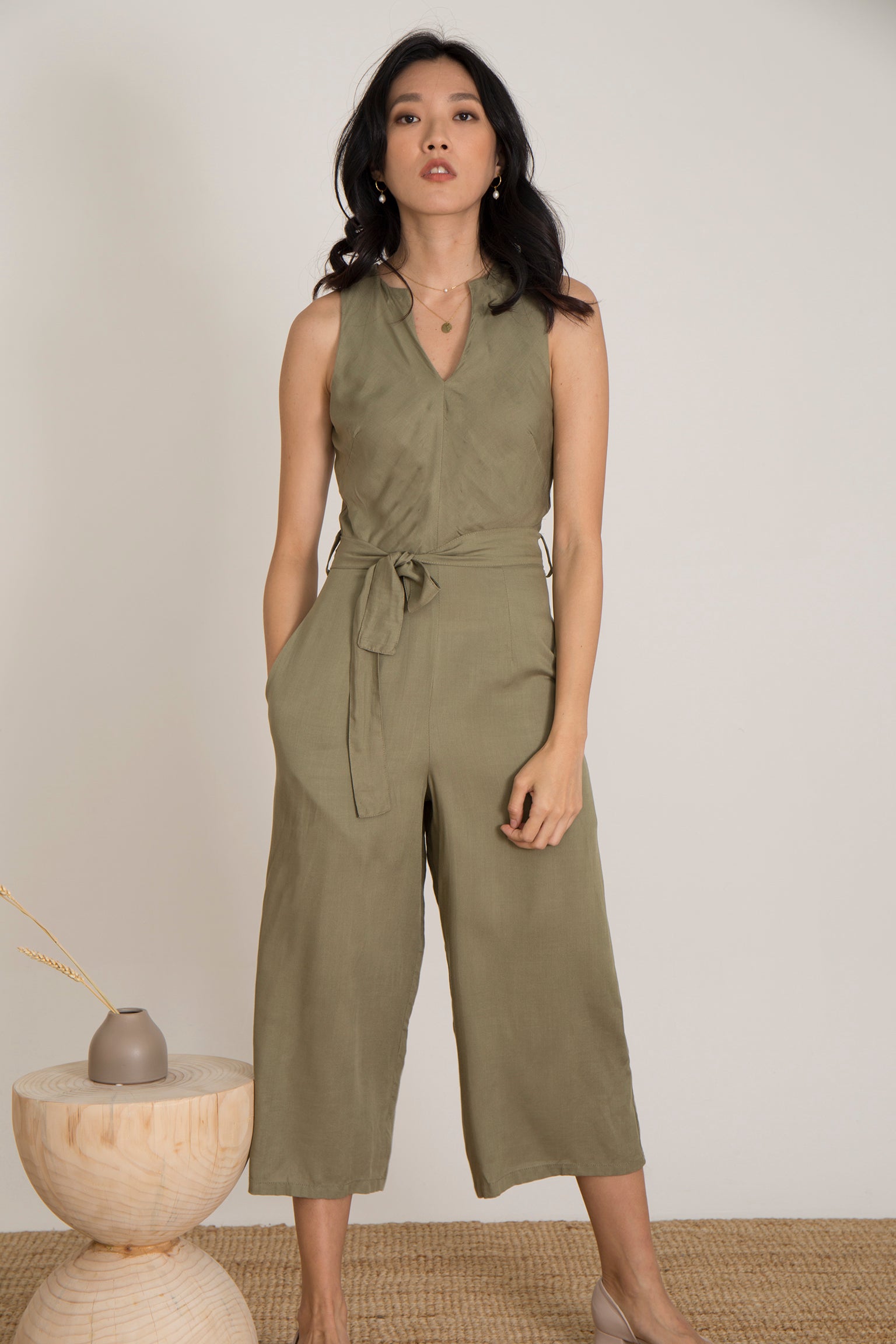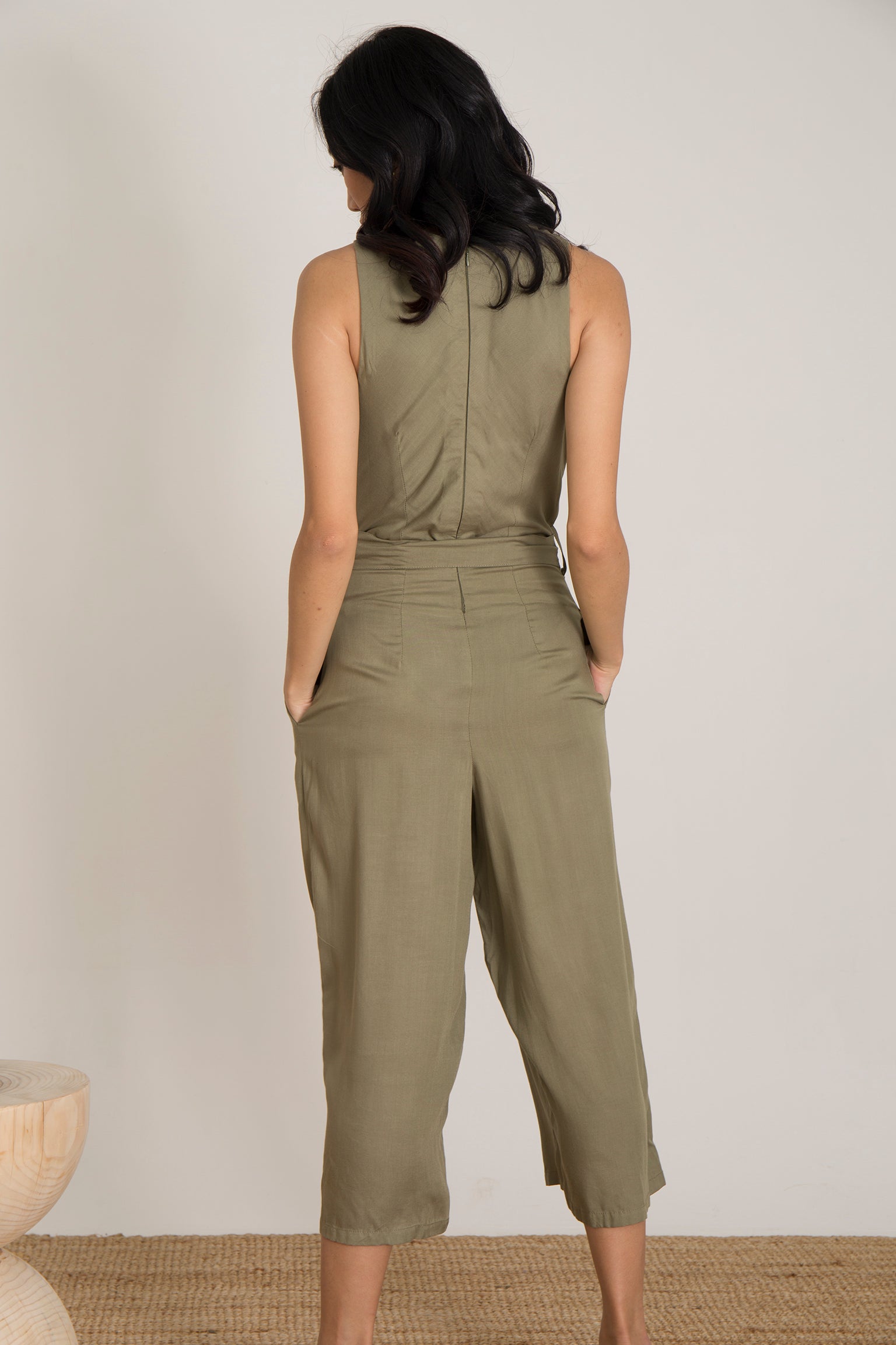 This wide-leg sleeveless jumpsuit is made from viscose poplin and has a V cut out neckline in place.