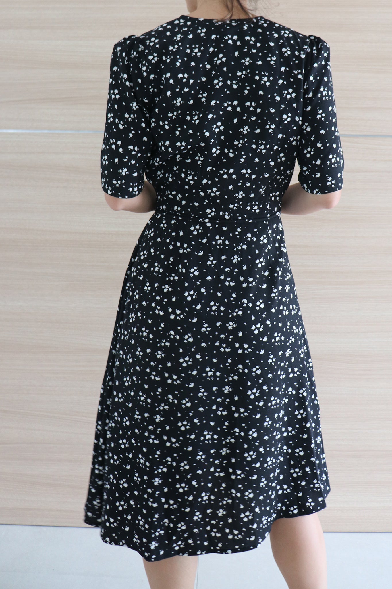 Our Alyssa splash printed wrap dress. It is cut asymmetrically with pleated details on the waist.
