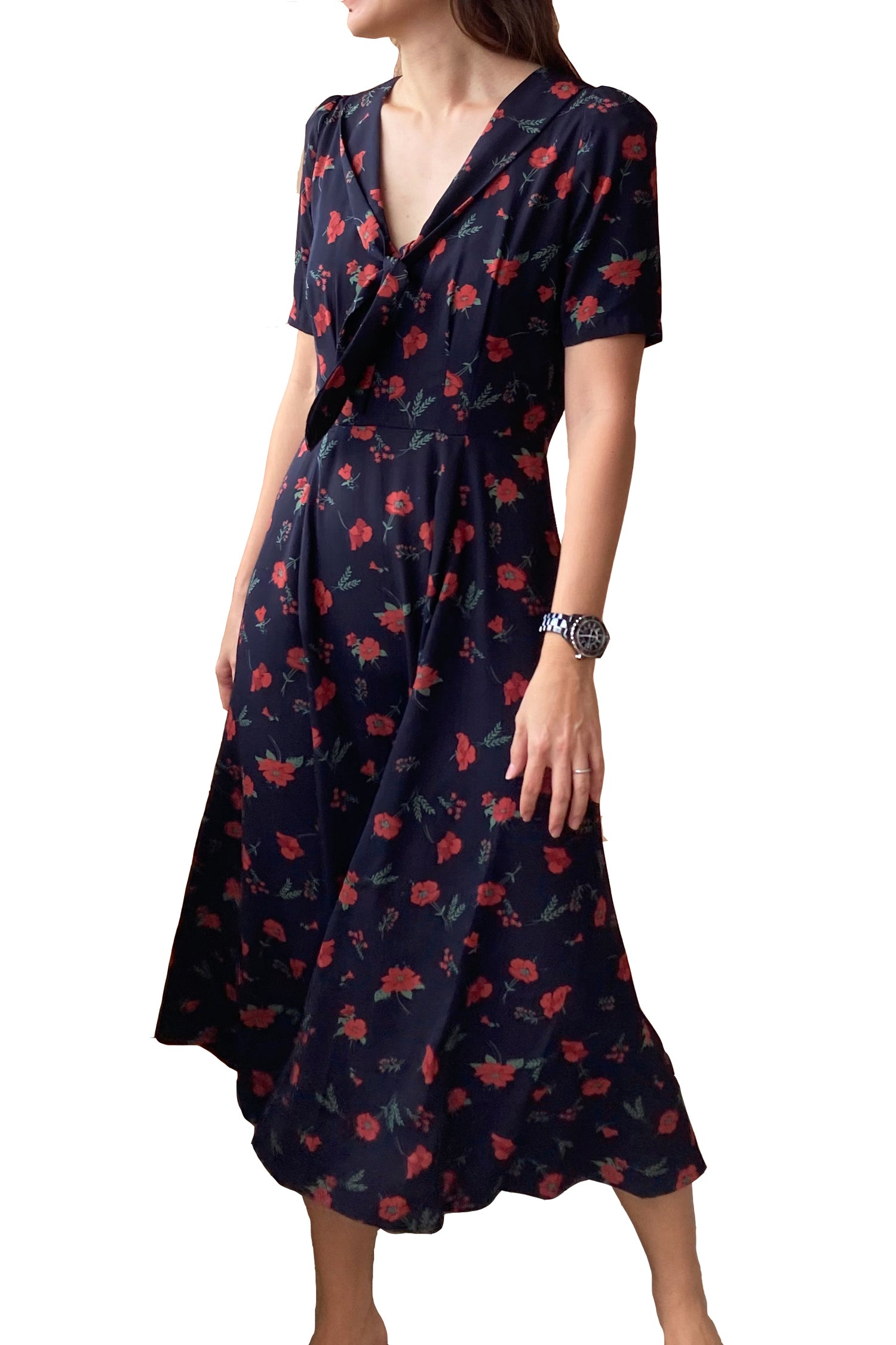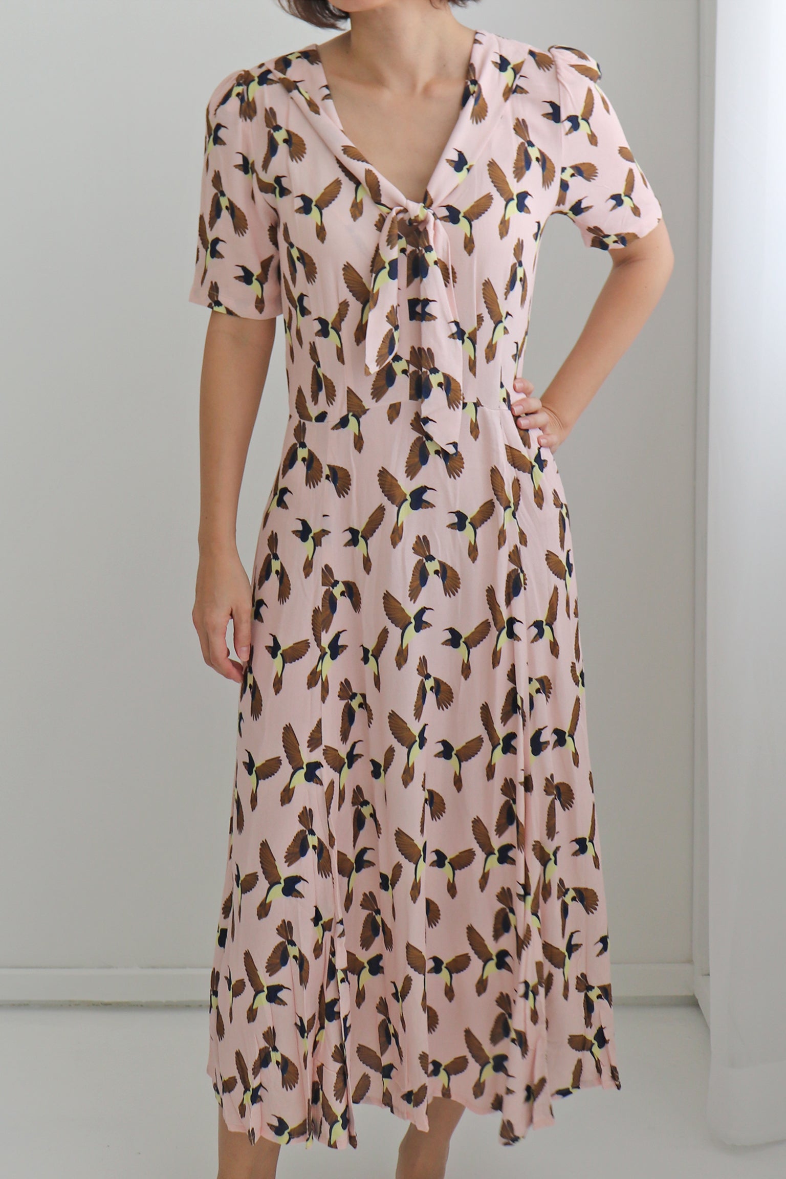This 100% rayon midi length dress has a v neck and pussy bow, it's the perfect dress to wear for brunch.