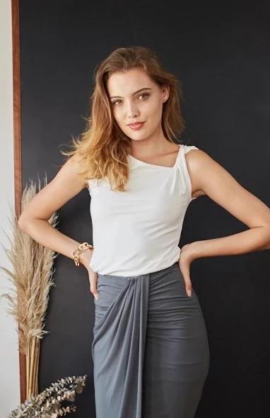 A side twist knot on the left shoulder adds a subtle touch of sophistication to an otherwise simple top.