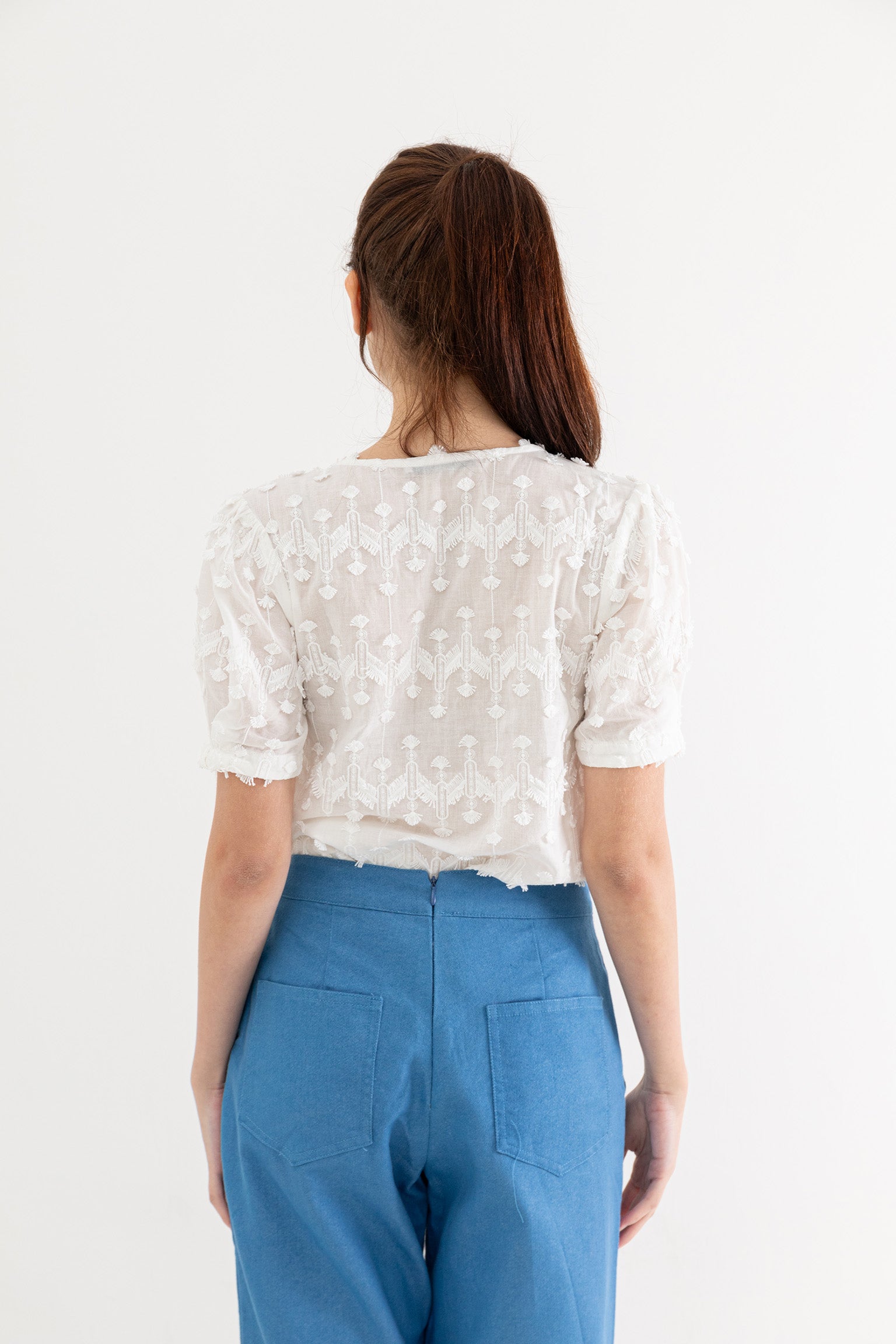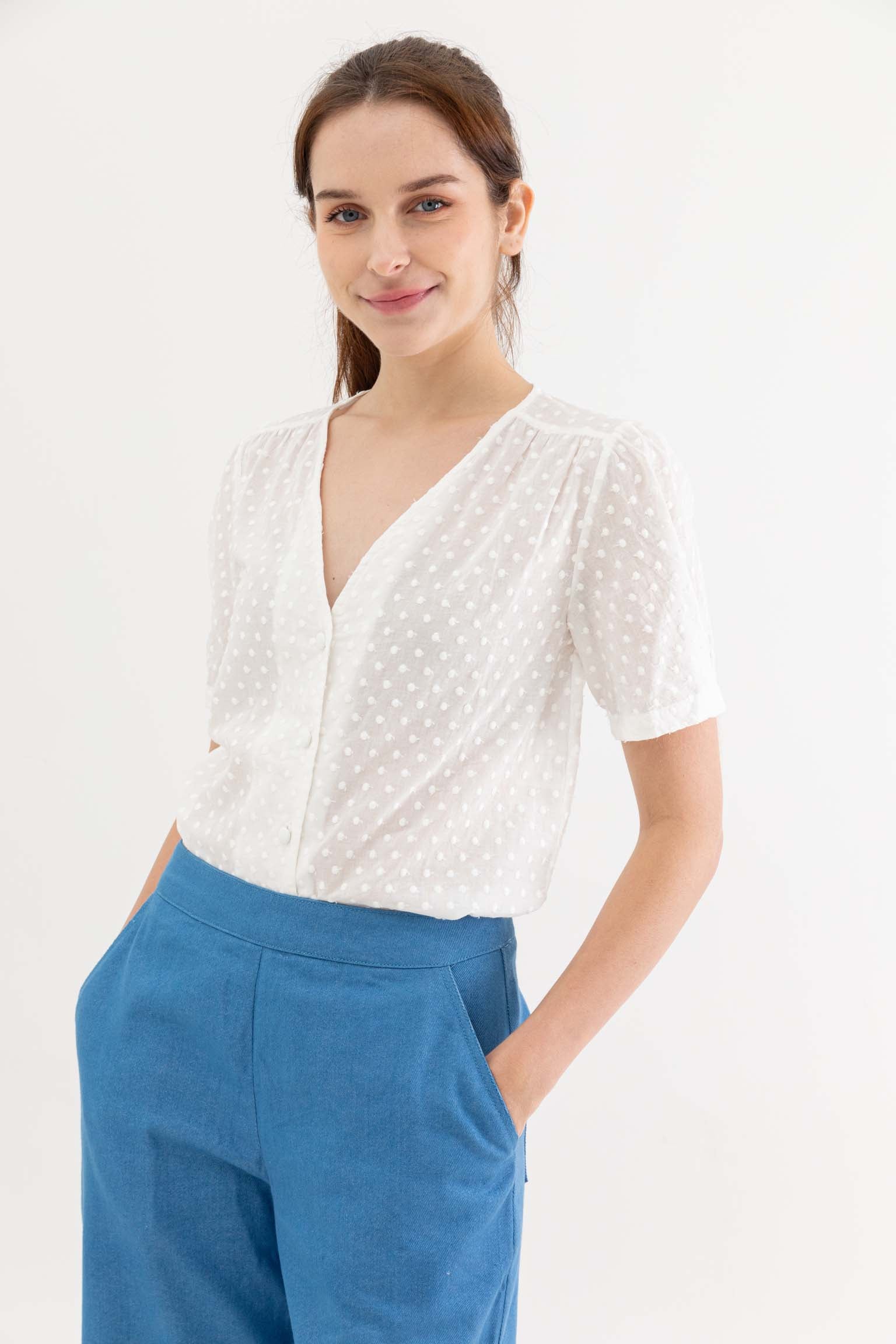 Our Claire cotton voile blouse is cut from cotton swiss dotted voile and framed with classic short sleeves with a pleated cuff.