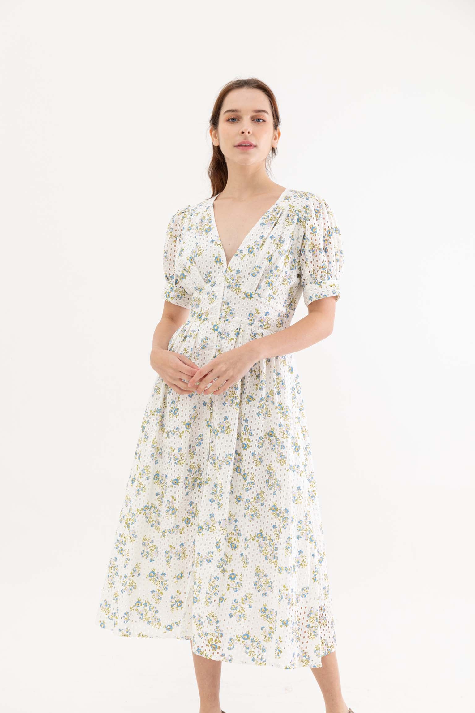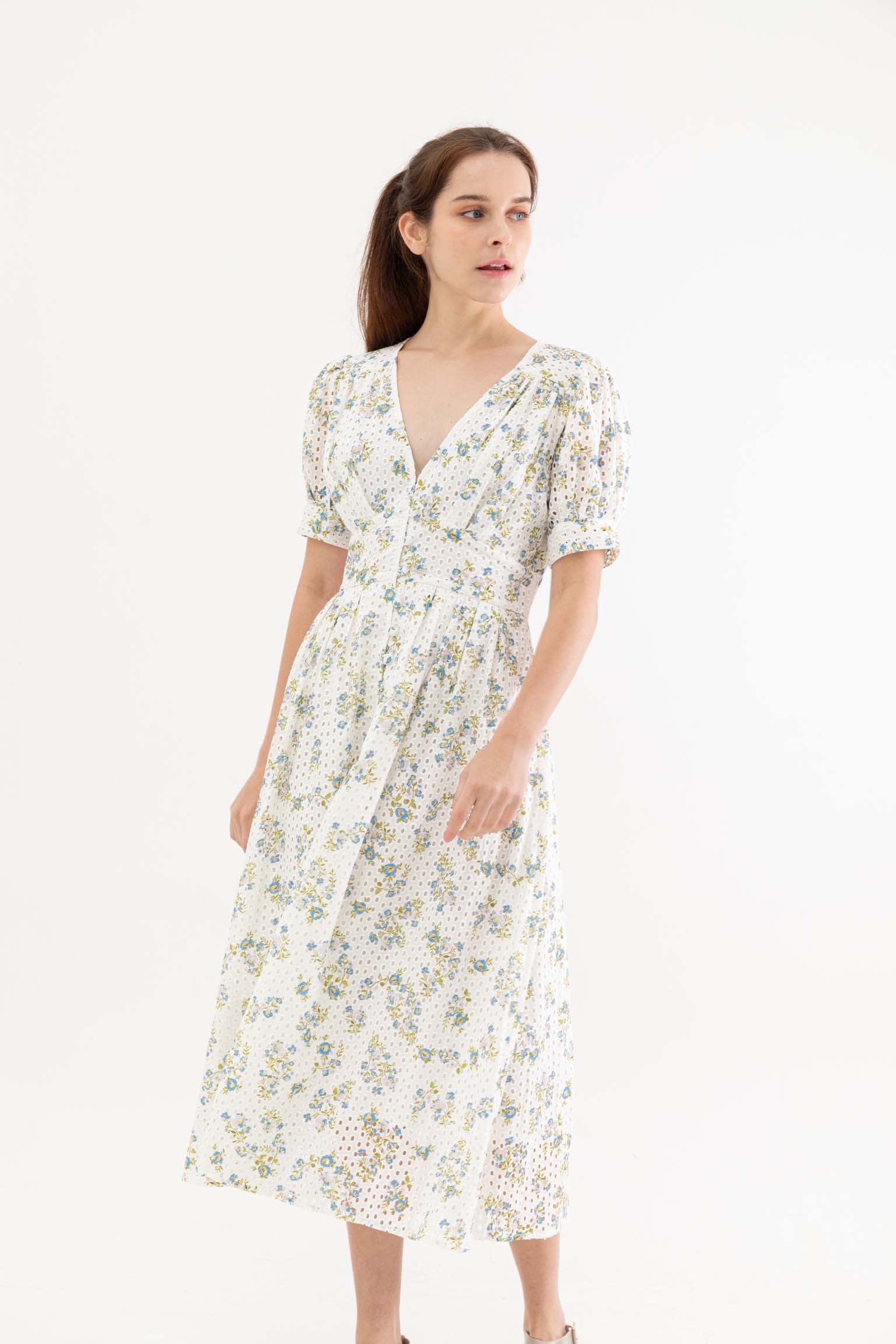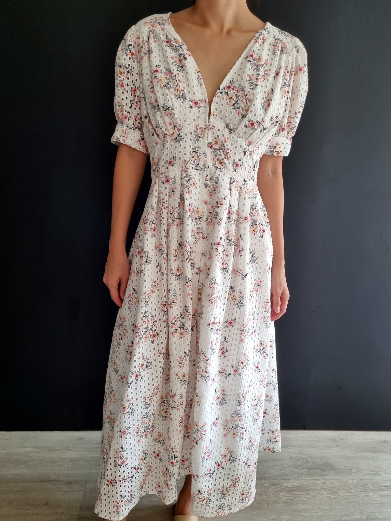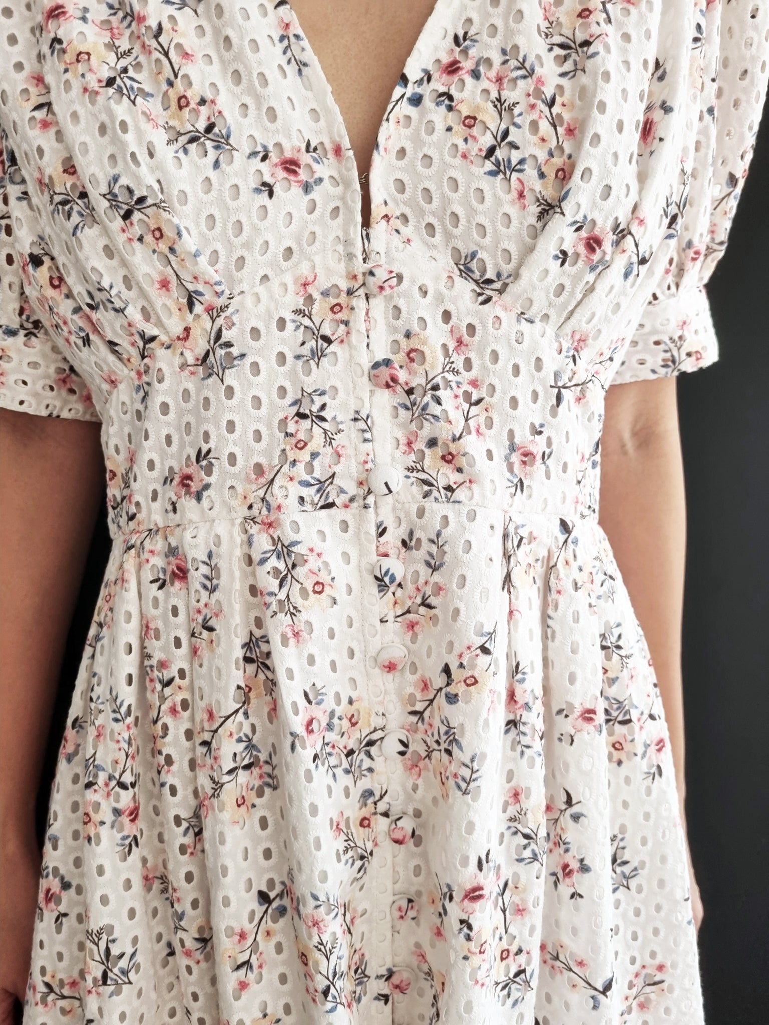 It's made from a sweet floral print cotton eyelet with a a cinched waistline and softly gathered midi skirt. The V neckline is perfect for showing off a delicate pendant.