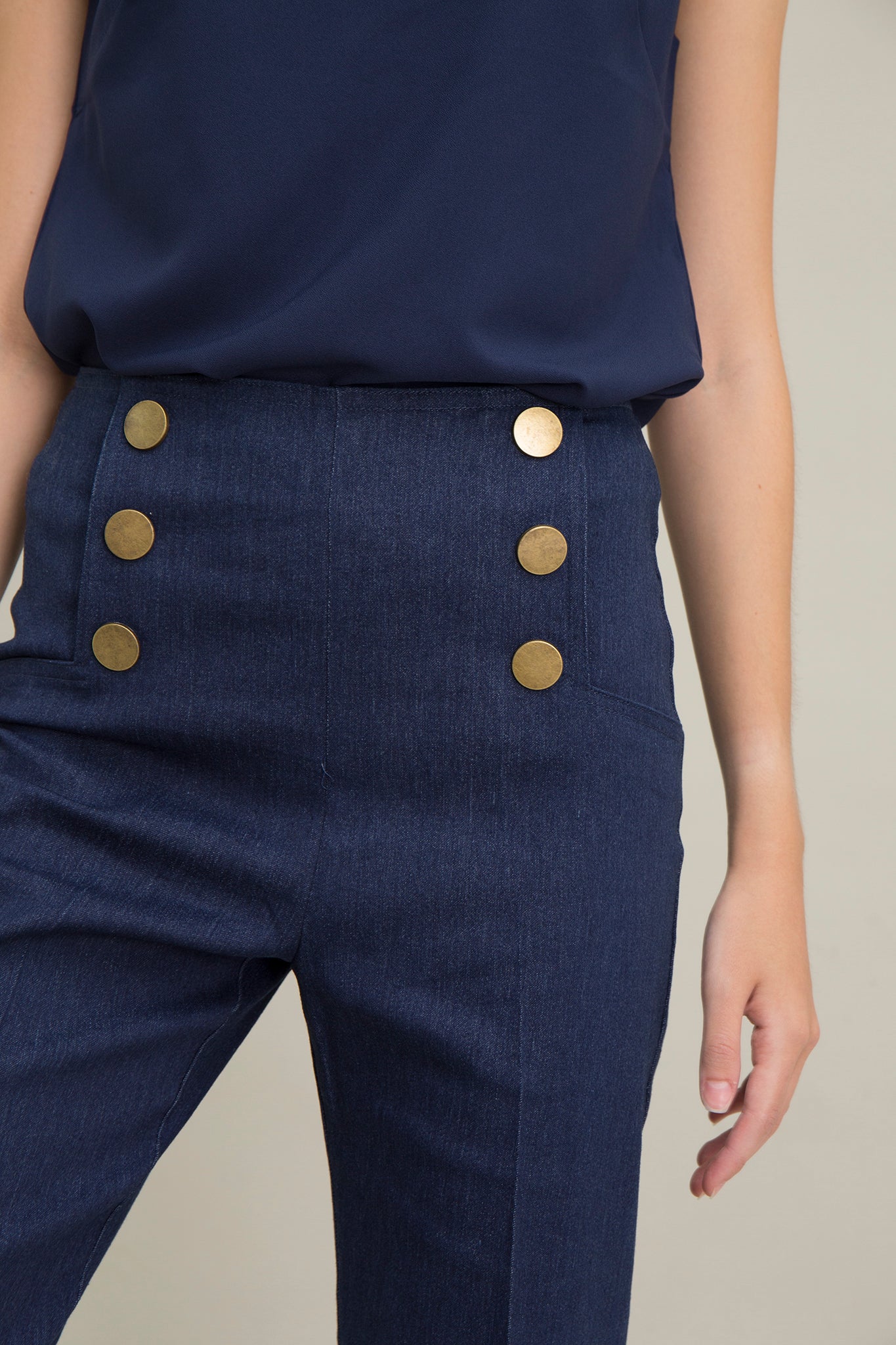 These pants are accented with vintage bronze exposed buttons on the front.