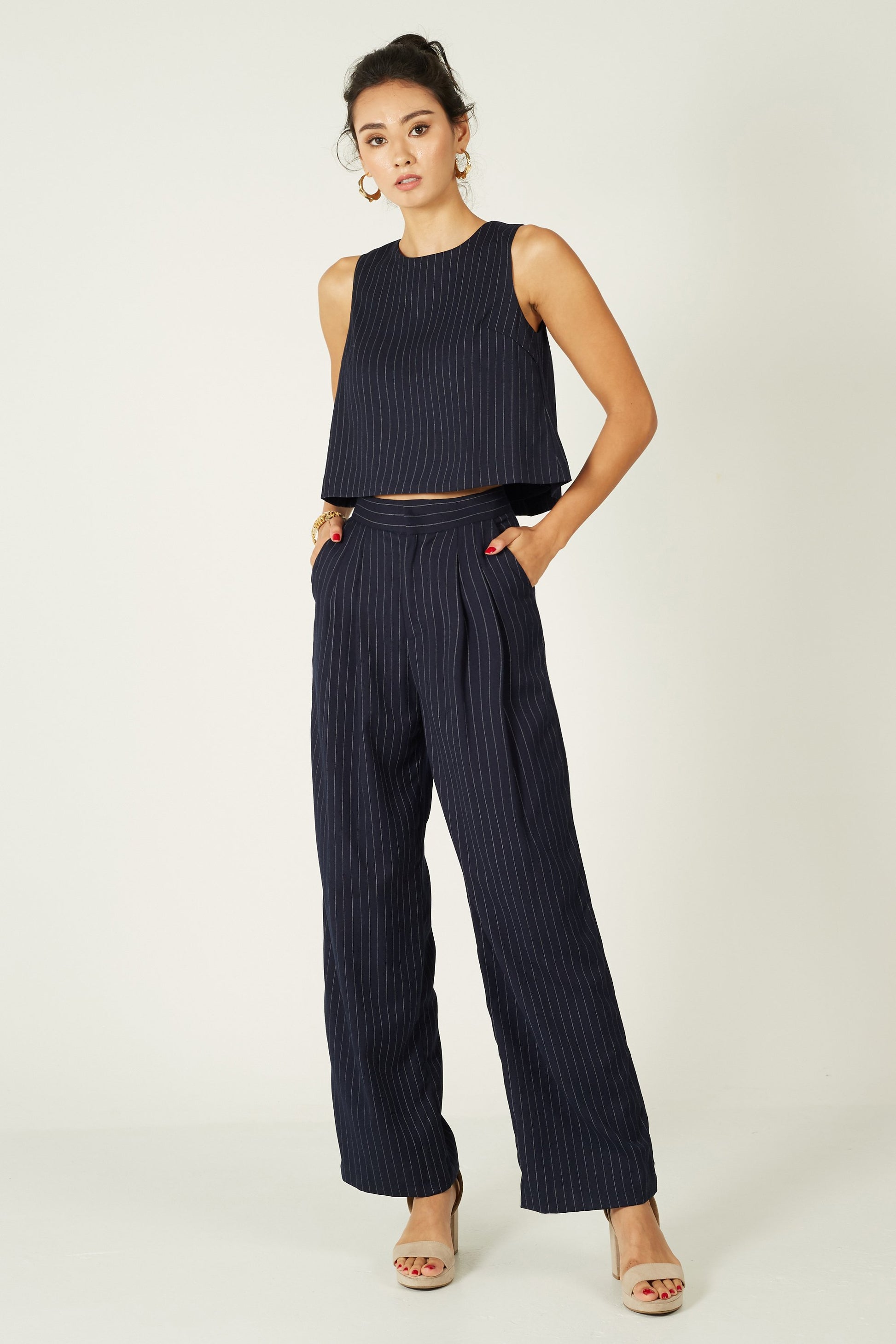 This sleeveless cropped top comes in both navy pinstripe and boardroom black. It can take you to the office and beyond, and is truly a wardrobe staple. Pair with high-waisted separates such as our matching Katherine wide leg pants or Lauren Knit Skirt.