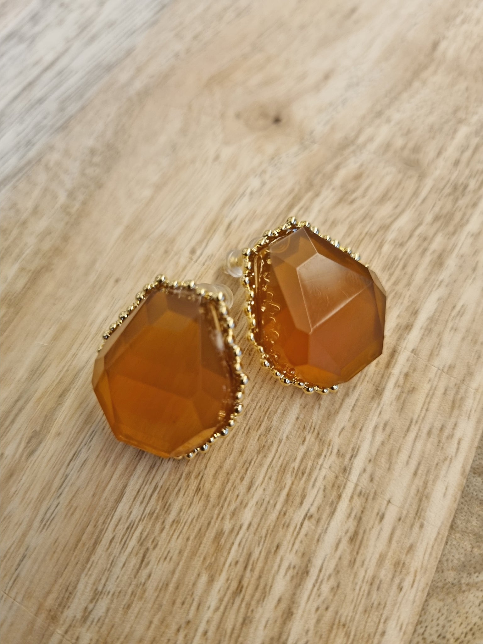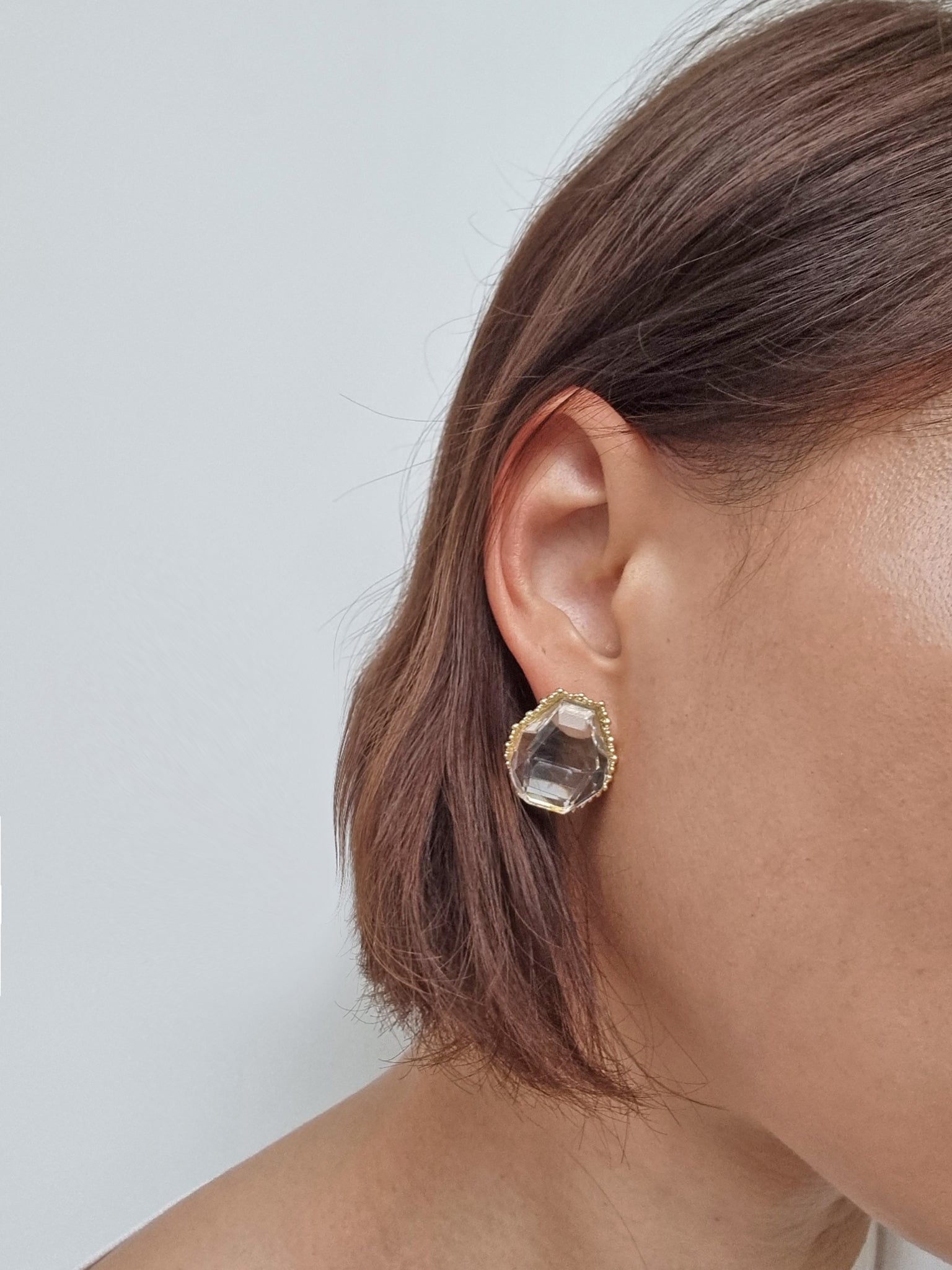 Geometric Crystal earrings with a thin hammered gold bezel setting.
