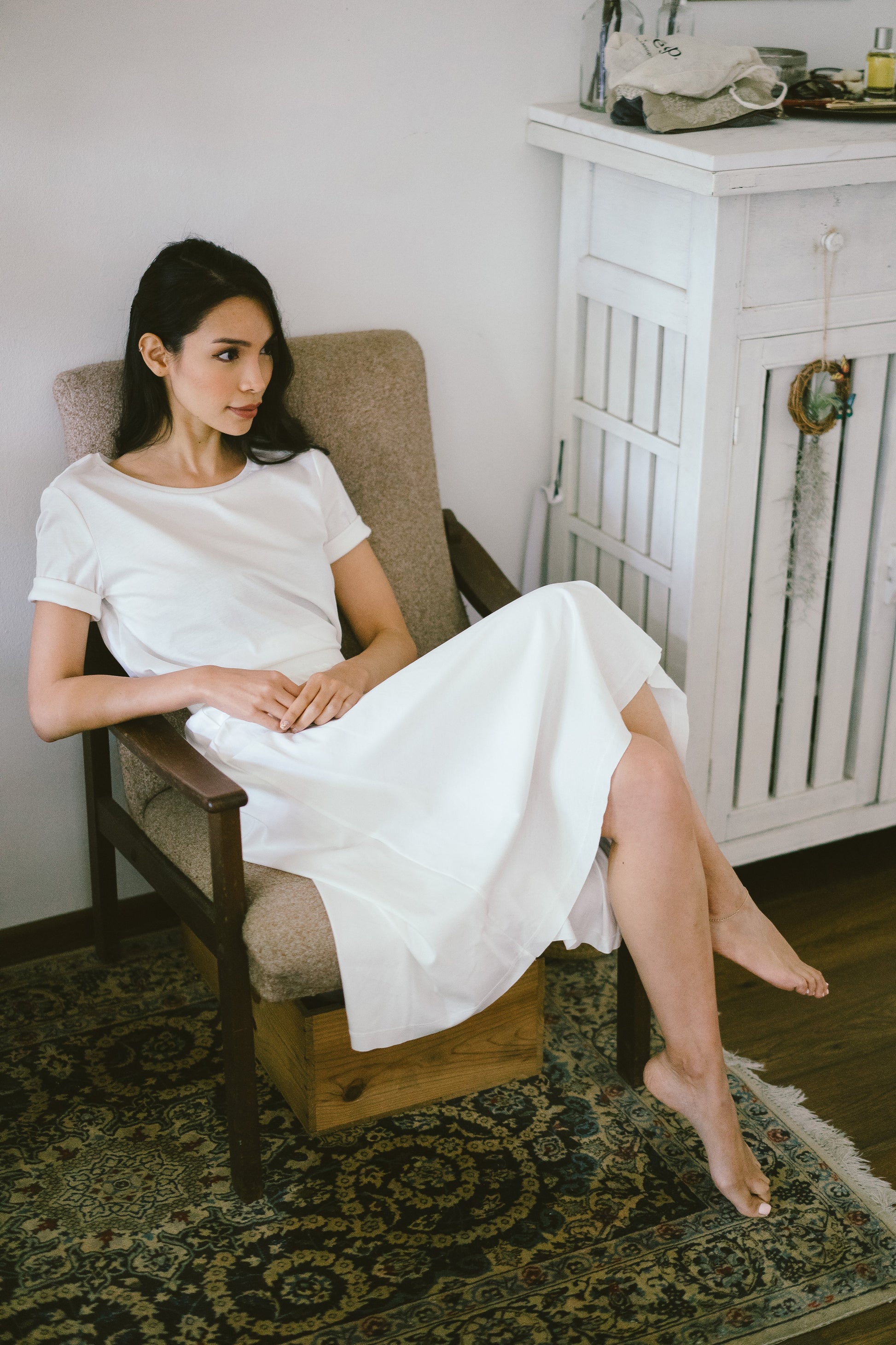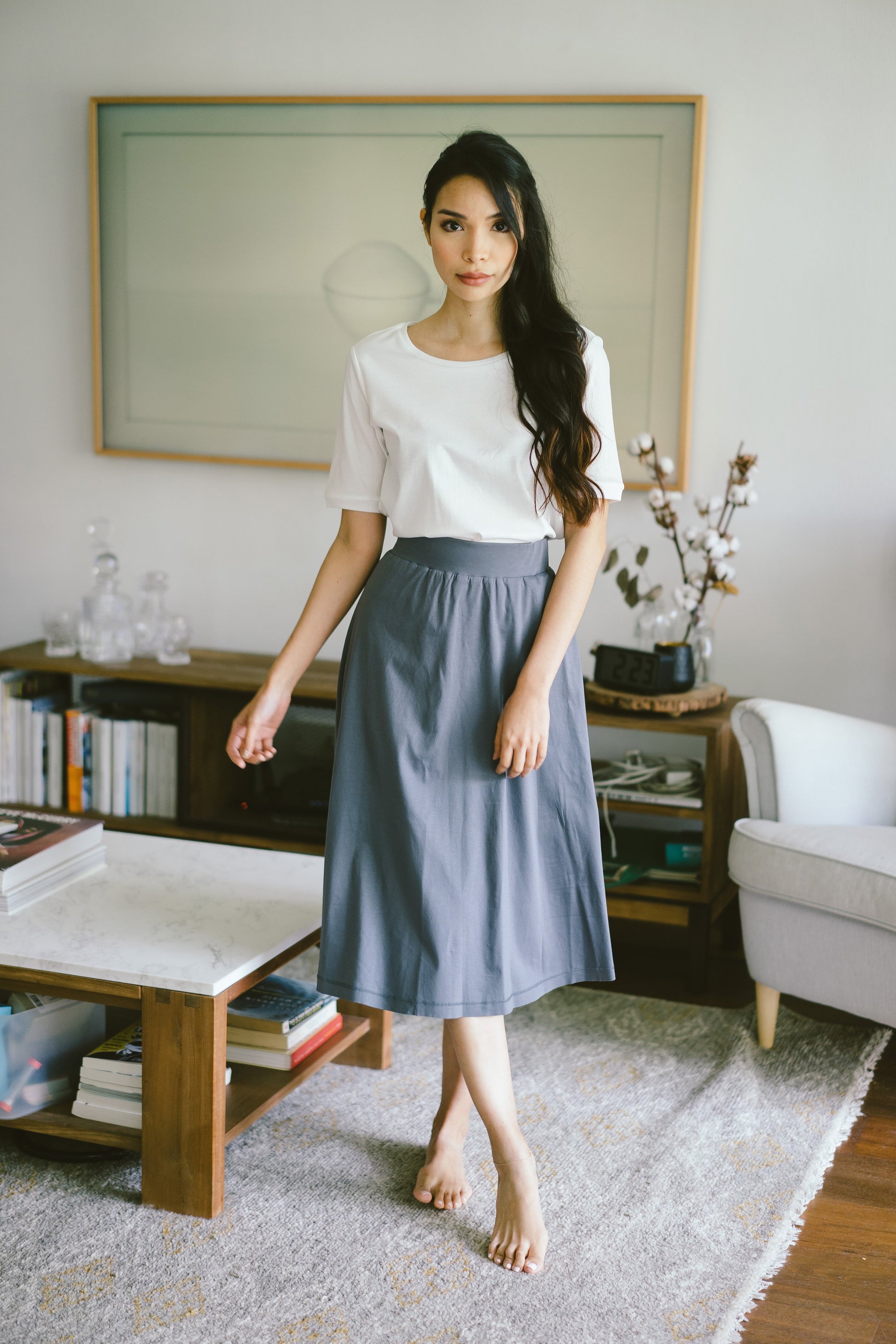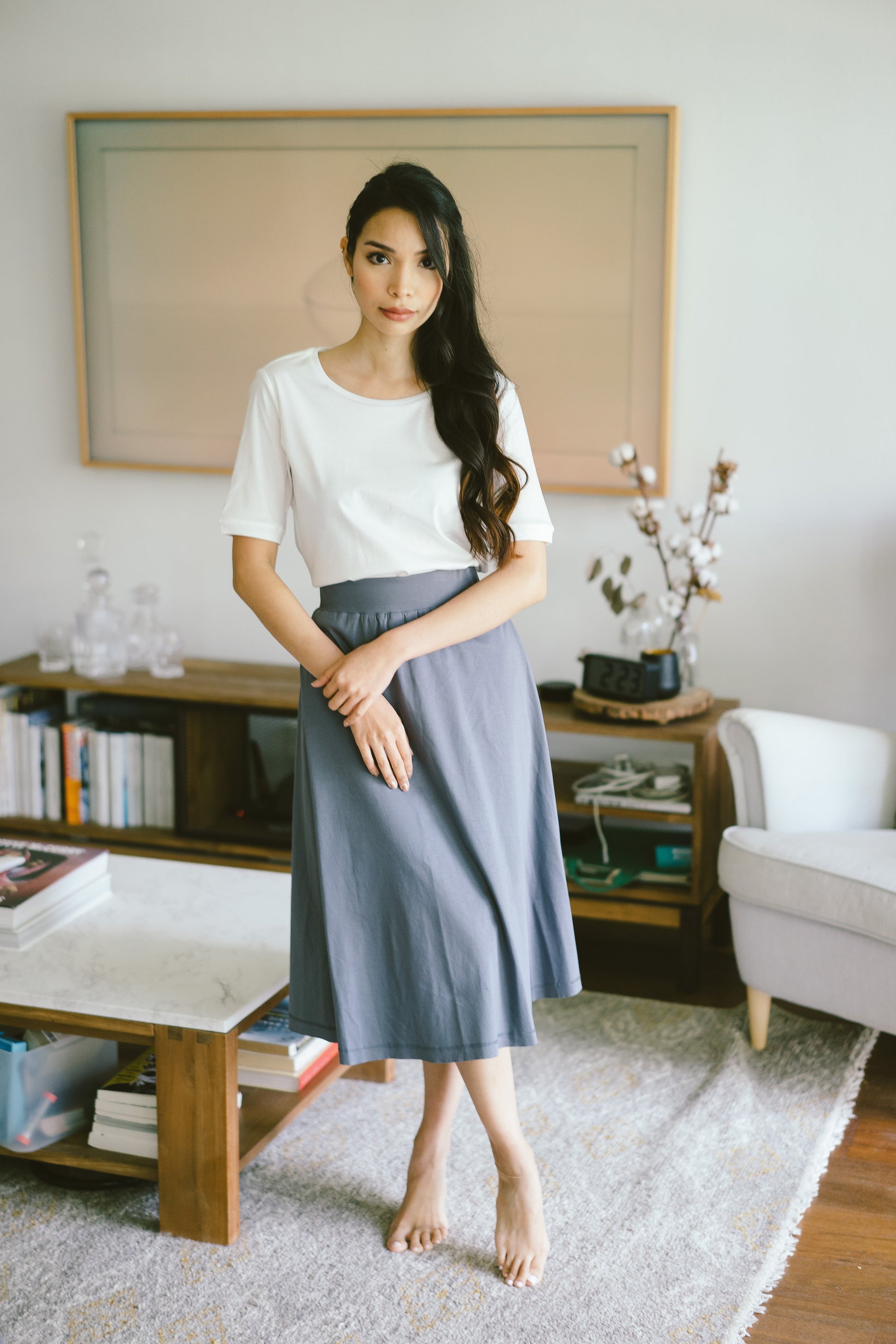 Fall through summer, the midi skirt has proven itself as a wardrobe staple. We sourced for the most comfortable of cottons to create this semi-circular skirt that falls below the knee with a raw finished hemline. Pair it with our Nadia t-shirt, made of the same fabric. Or dress it up with a tight fitted knit body shirt or polo tee.