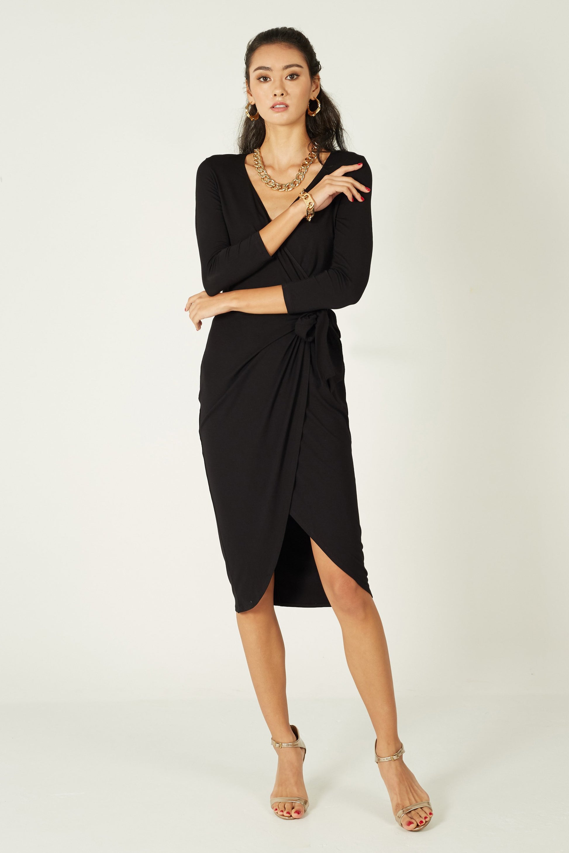 Part of our first eco-conscious collection. Our fascination with wrap dresses continues, and this one is a midi length dress with V neckline, 3/4 sleeves, a wrap skirt and waist tie.