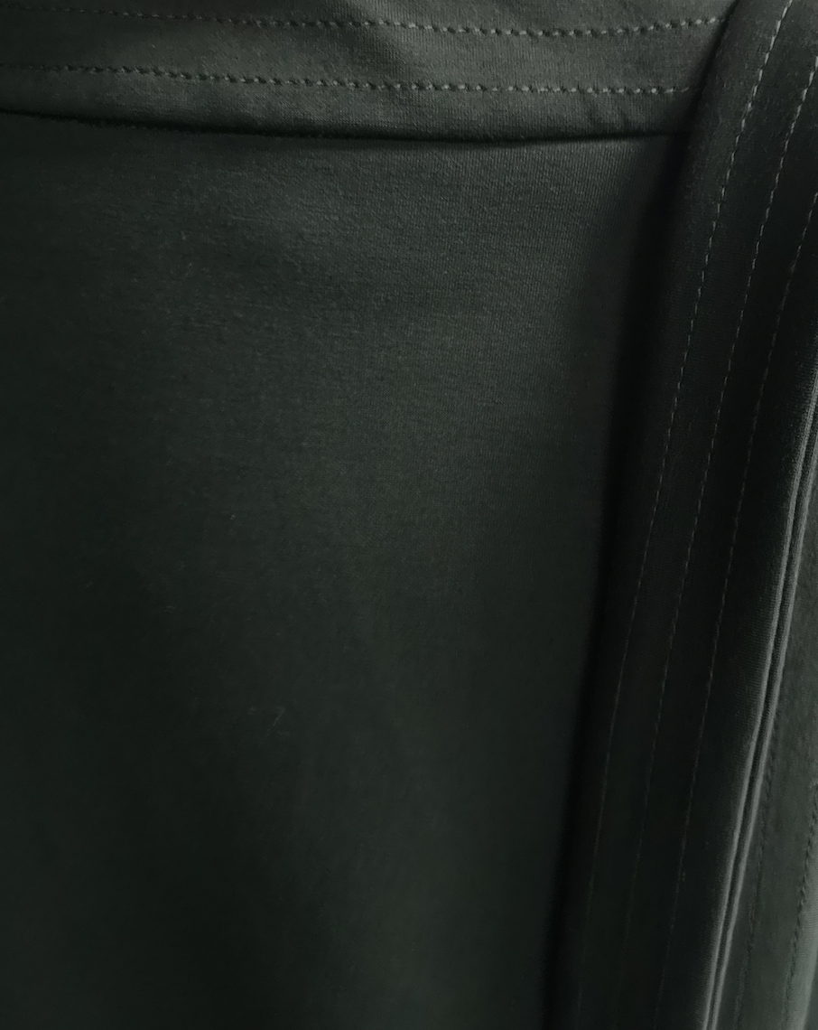 It's made from a neoprene stretch fabric that beautifully holds the A-line shape and has an appropriate slit at the asymmetric hem, with an attached obi belt at the waist.