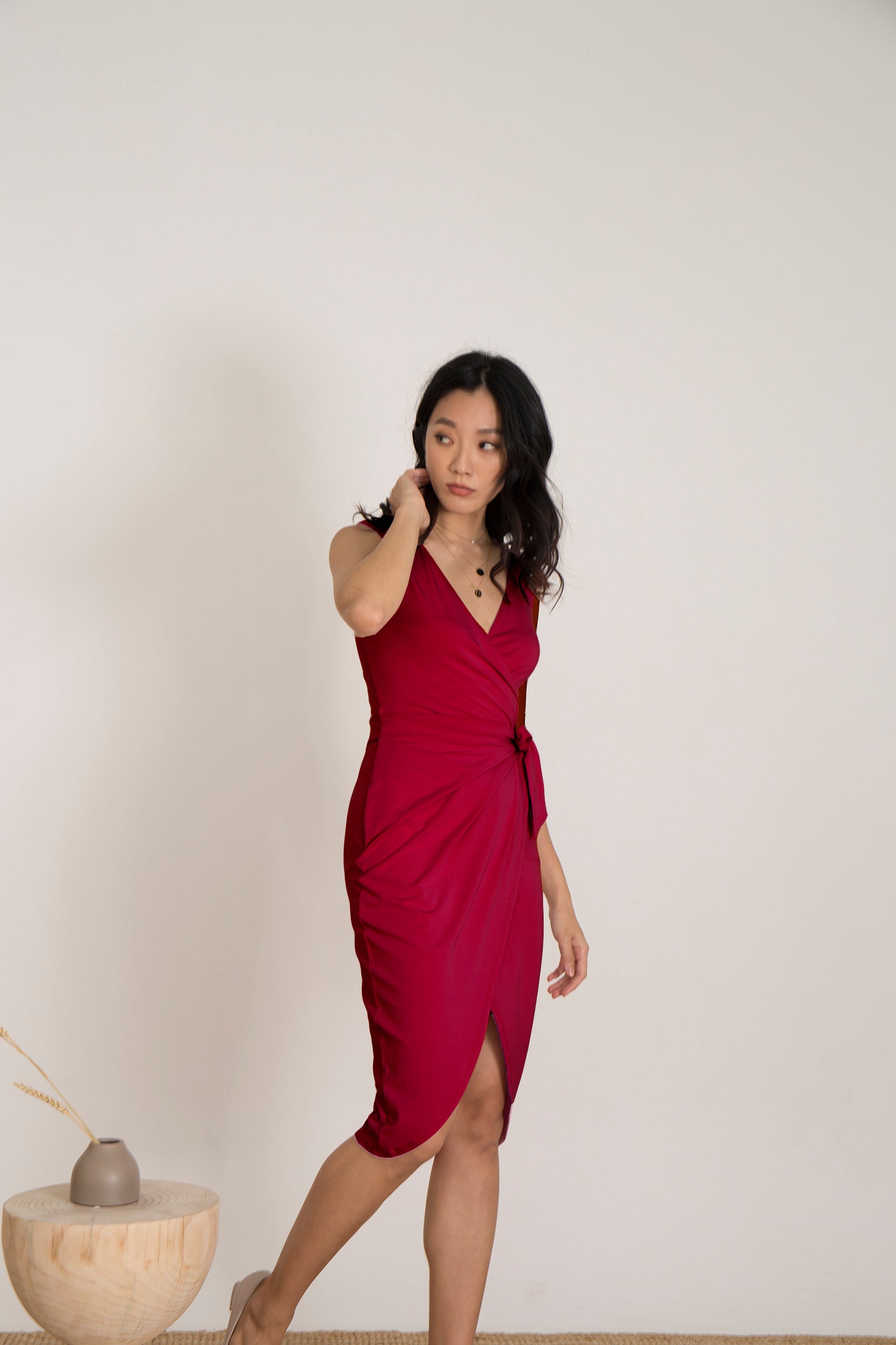 Our fascination with wrap dresses continues, and this one is a midi length dress with V neckline and a wrap skirt and waist tie.