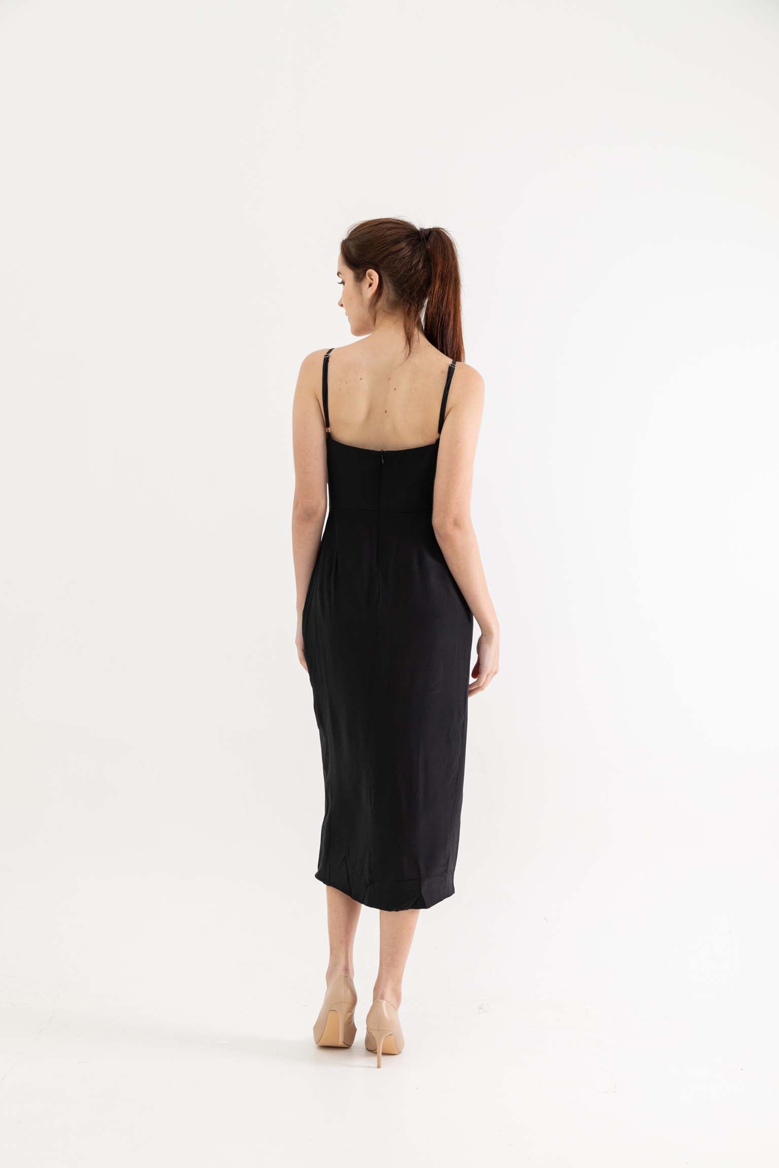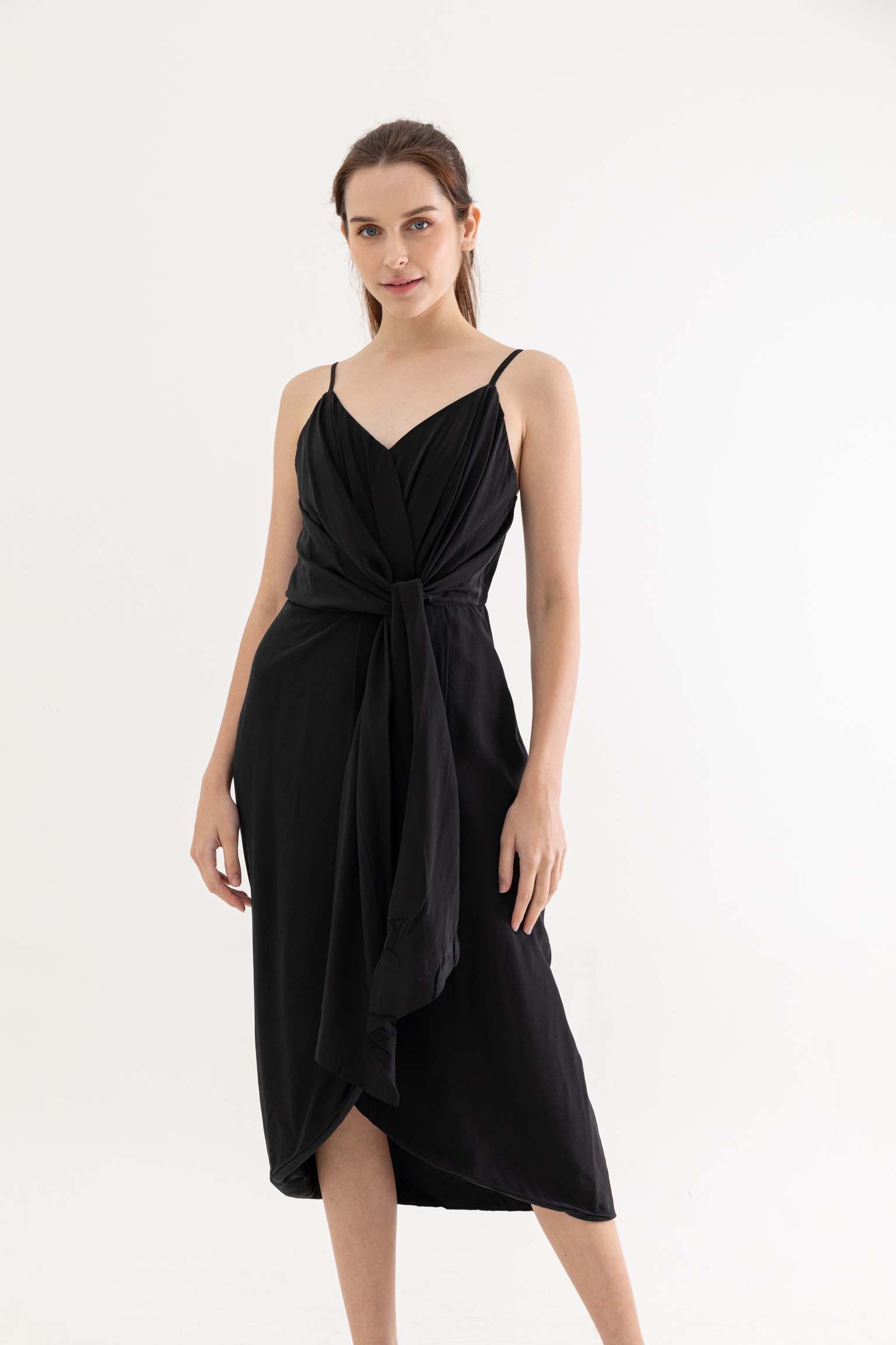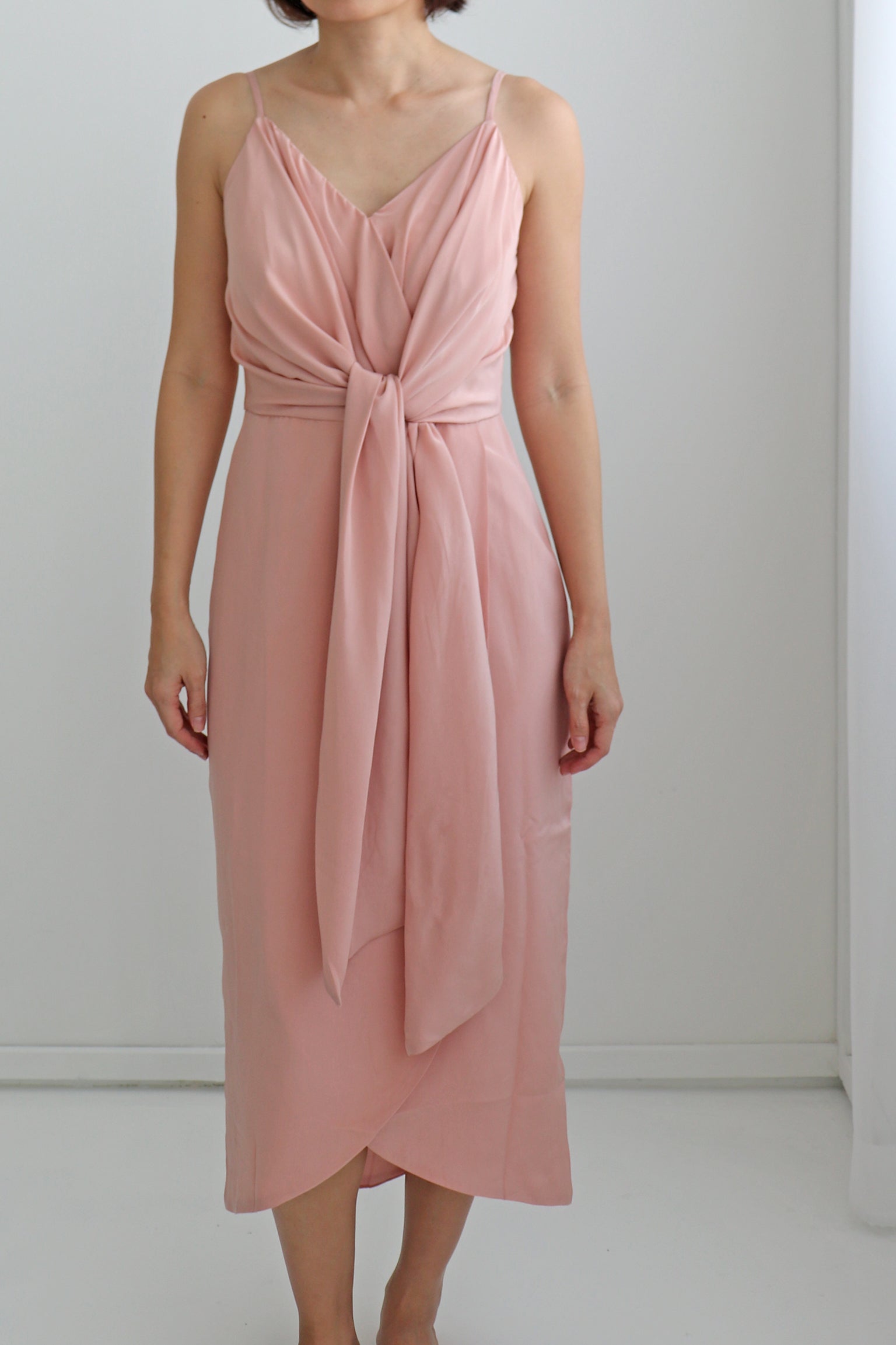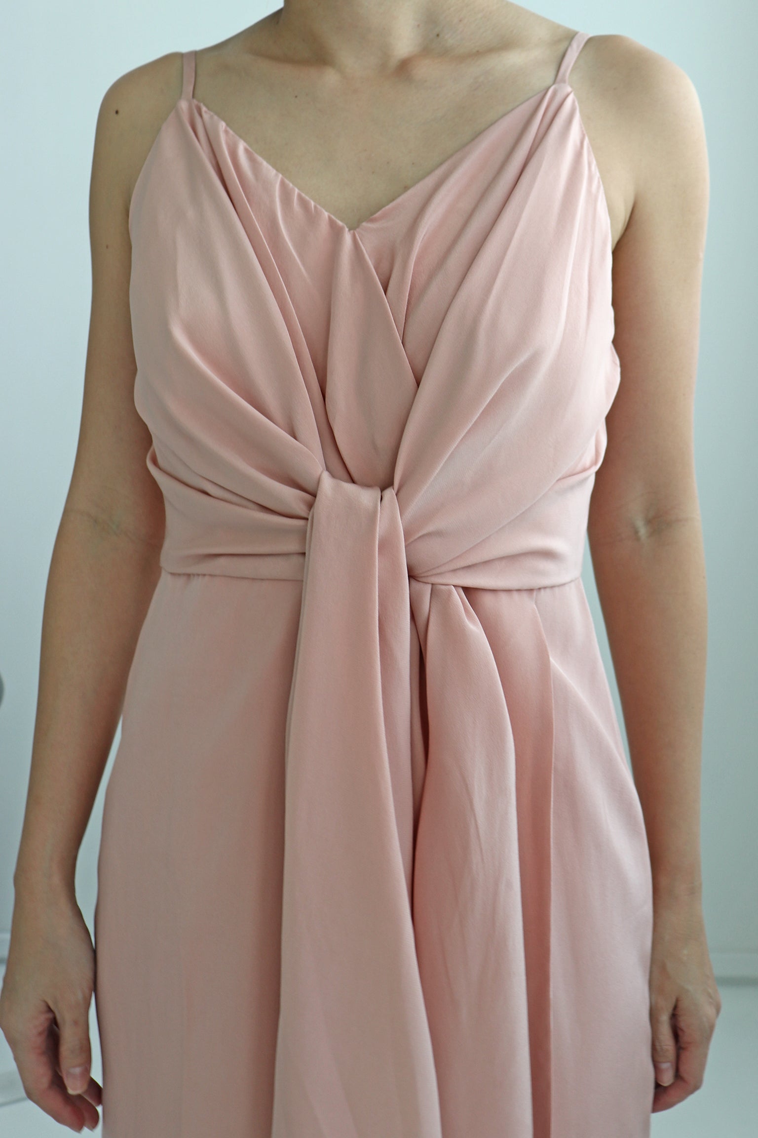 Our Mackenzie knot dress comes with adjustable straps and has twisted ties at the front and a wrap-effect skirt.