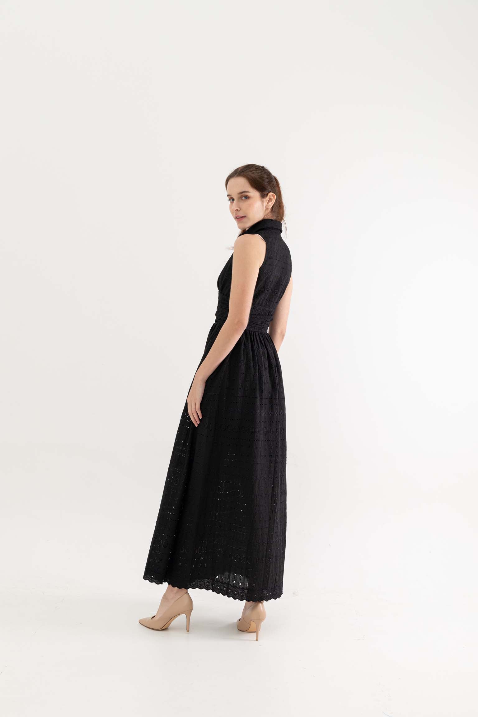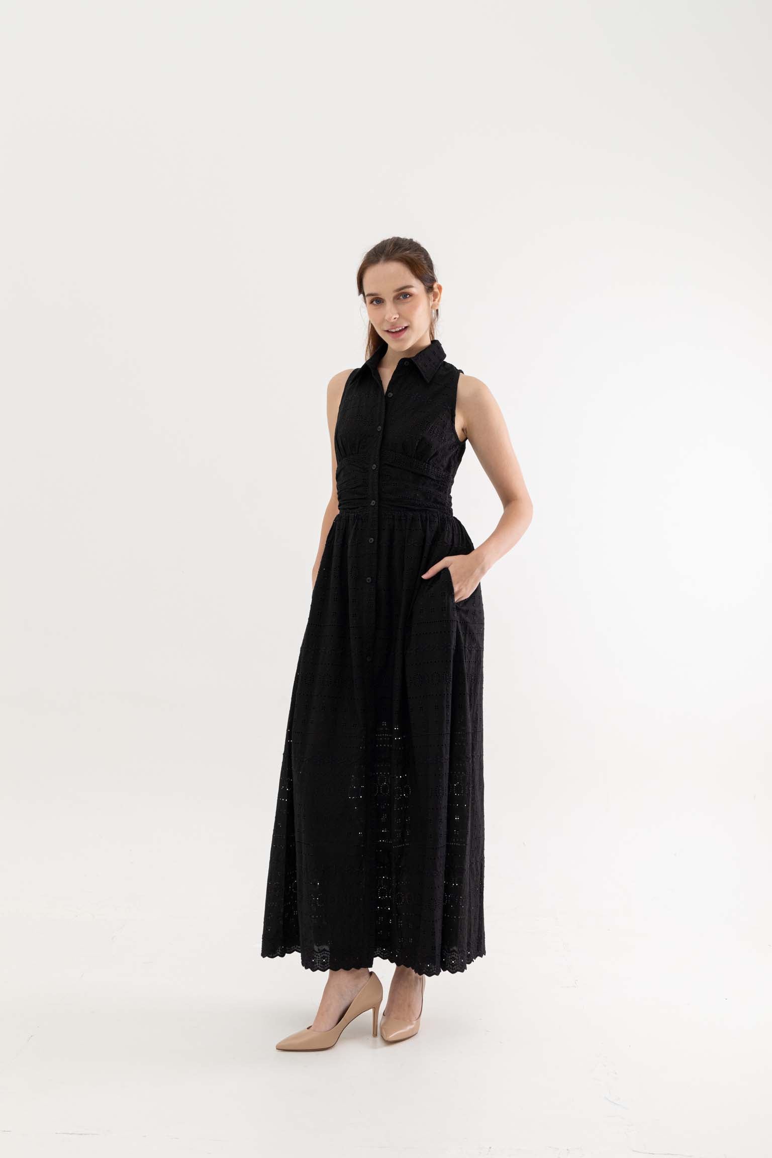 This midi length sleeveless shirt dress is made from a beautiful cotton eyelet fabric and has a ruched waist to cinch and define your figure. Dress it up with heels to a dinner or sandals for a smart casual brunch