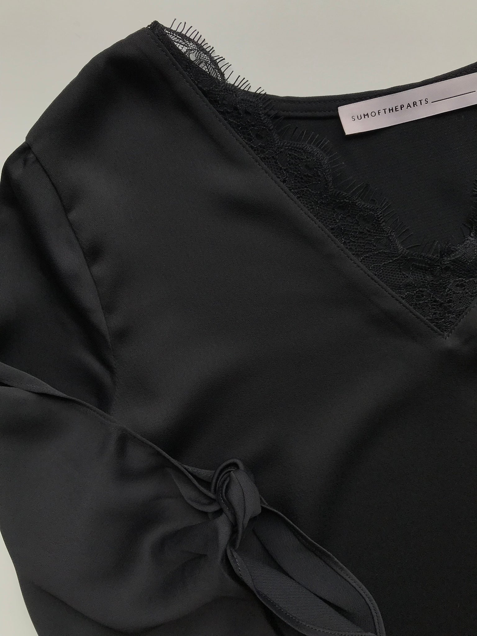 Our Smith ¾ sleeve knotted sleeves V-neck top is made of a luxurious satin-feel crepe.