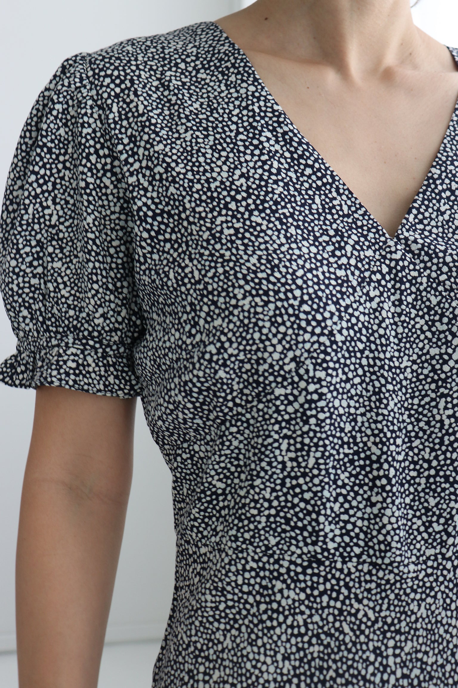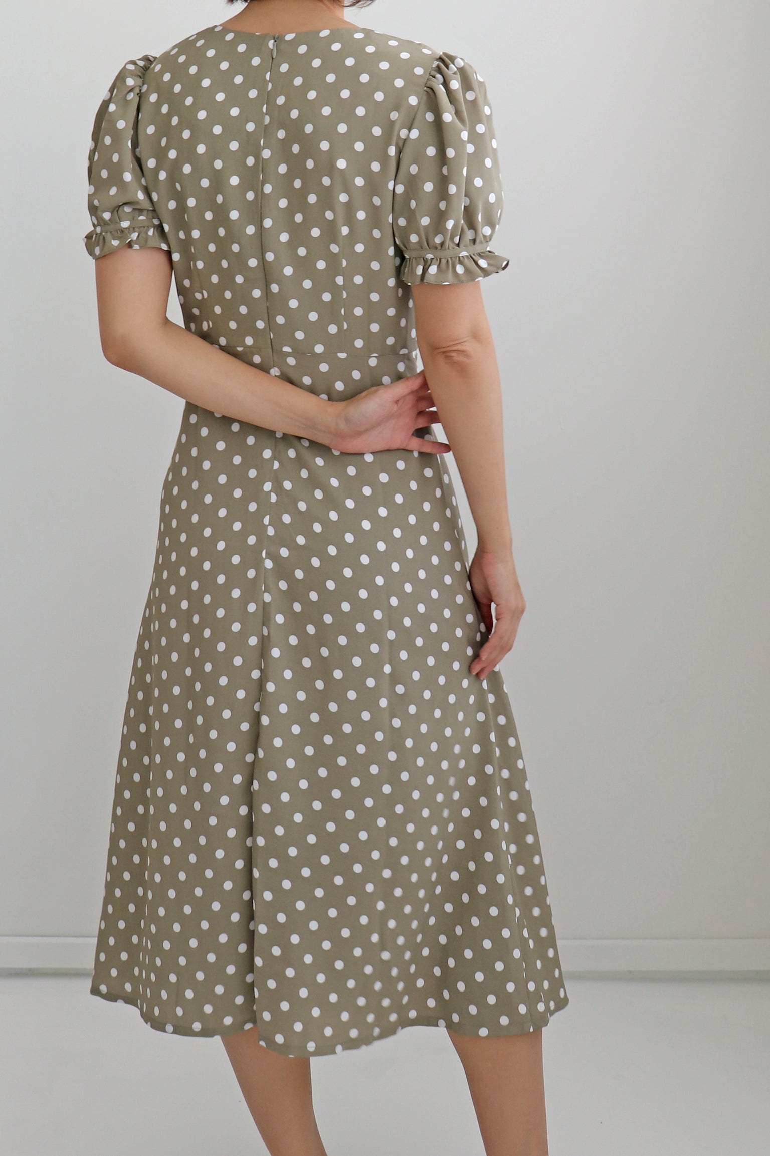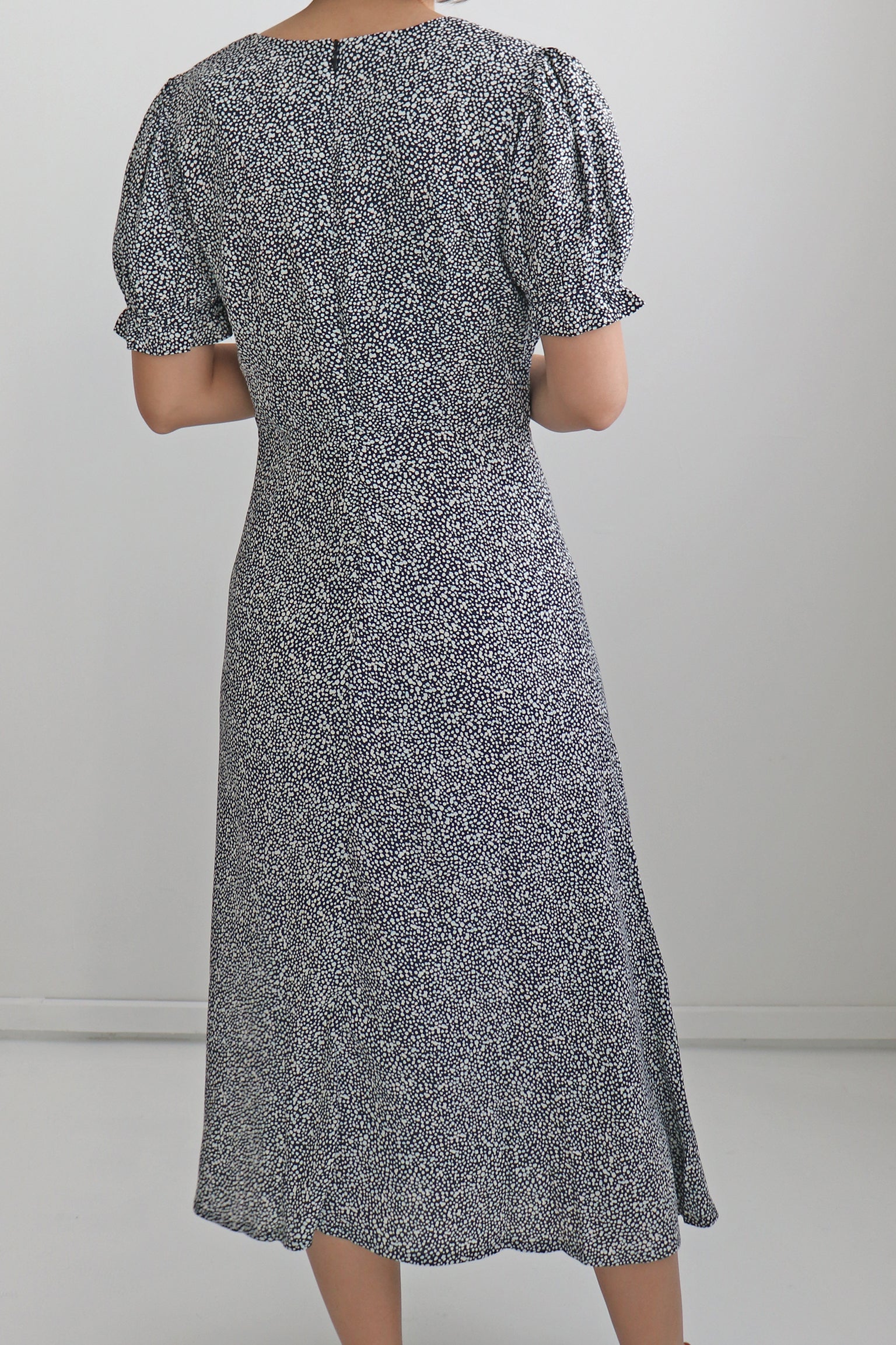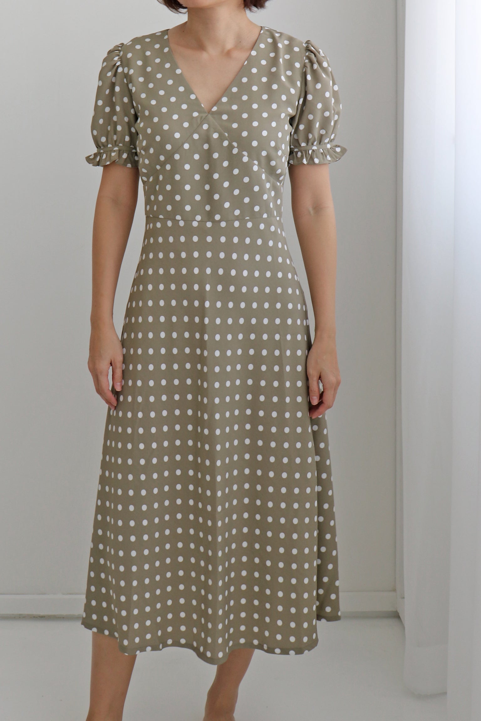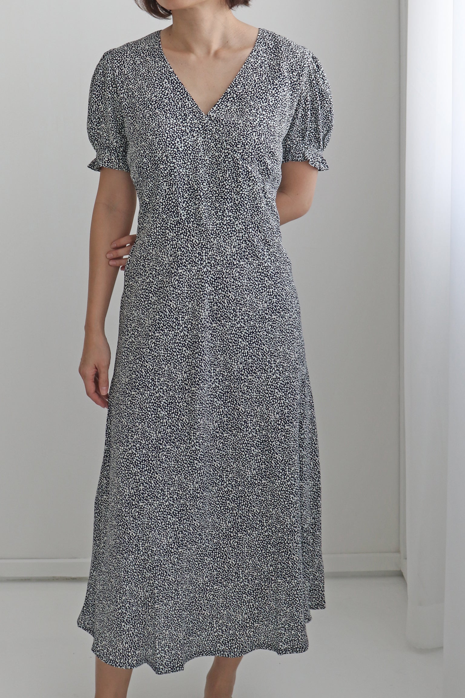 It's cut from crepe with puffed sleeves and a bias cut skirt that hugs your figure perfectly.